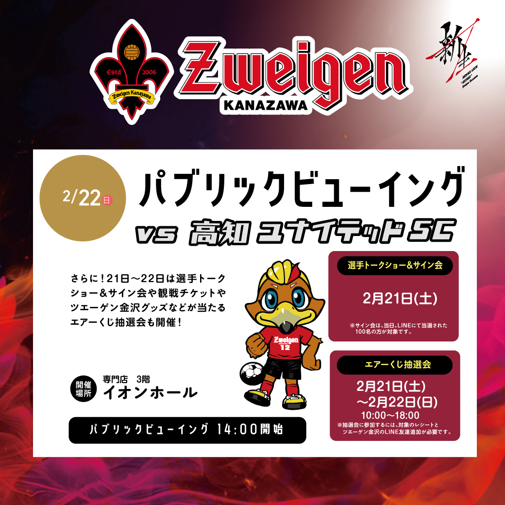 高知ユナイテッドSC戦のパブリックビューイングを開催!さらに21日~22日は選手トークショー&サイン会や、観戦チケット・ツエーゲン金沢グッズなどが当たるエアーくじ抽選会も開催!