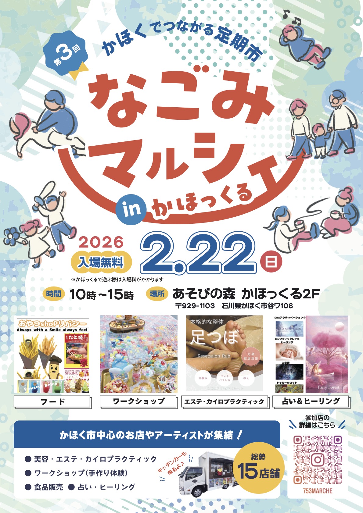 雑貨・グルメ・占い・ワークショップ・キッチンカー・エステ・カイロプラクティックなどかほく市中心のお店やアーティストが集結!(かほっくるで遊ぶ際には入場料がかかります)
