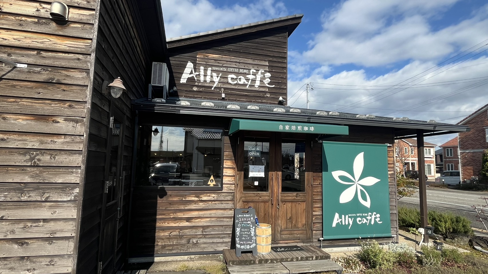 海側幹線より、アルビス畝田店とクスリのアオキ畝田店の間を通り、左手を見てみると、木で作られた建物と、緑の背景に白い花模様と白文字で「Ally Caffe」と書かれた暖簾が目印です。駐車場は7台で広々していました。スーパーが近いため、買い物帰りに美味しいコーヒー豆を、と車で買いに行きやすい立地ですね!