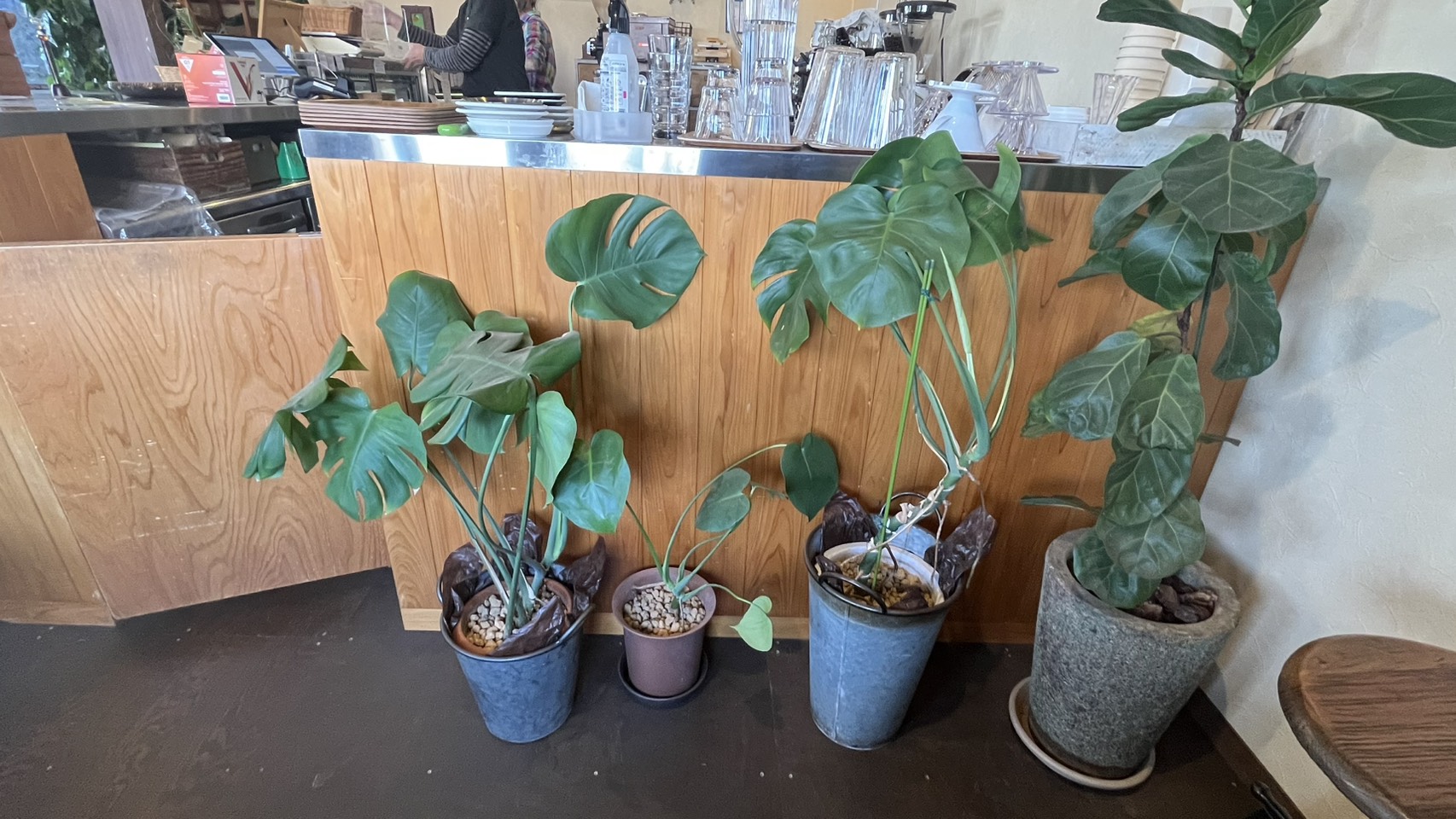 コーヒー農園を想像させるような植物と木をメインとした店内