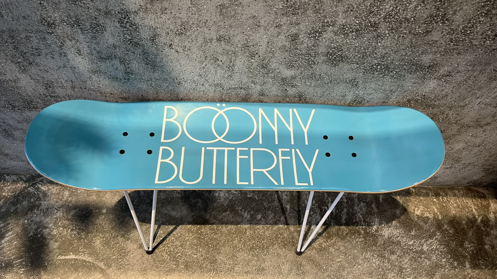 レジカウンターの下には白い文字で「BONNY BUTTERFLY」と書かれた青のスケートボードの板が。