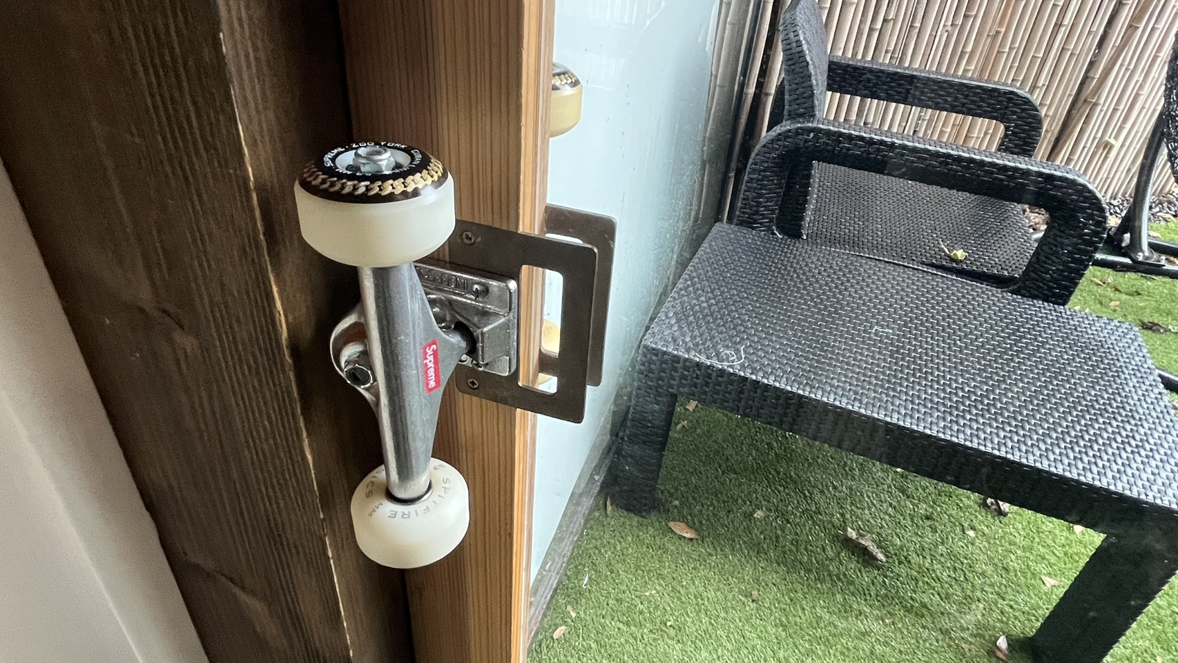 テラスの扉の取っ手はなんと!スケートボードのタイヤが使われております。言われるまで全く気づかなかった!