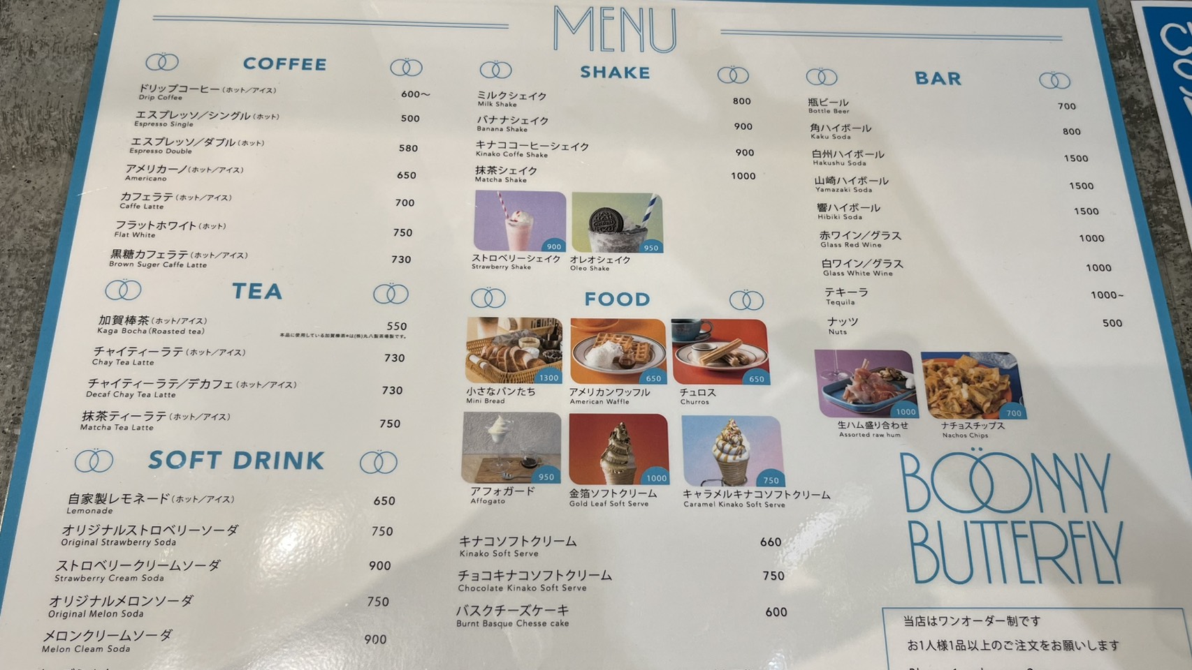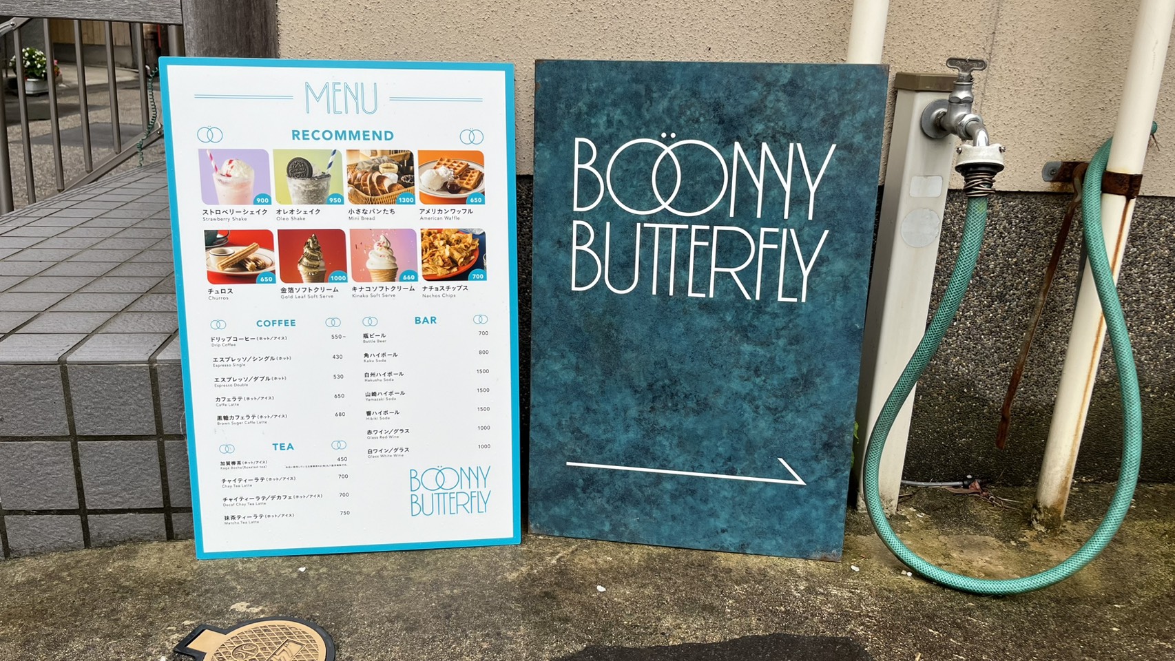 おいしそうな食べ物の写真と藍色の看板に「BONNY BUTTERFLY」と矢印が書いてありました。