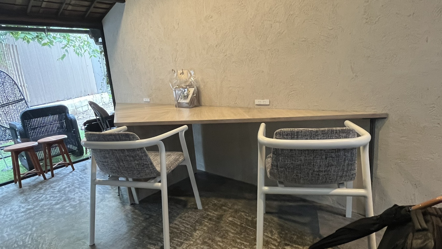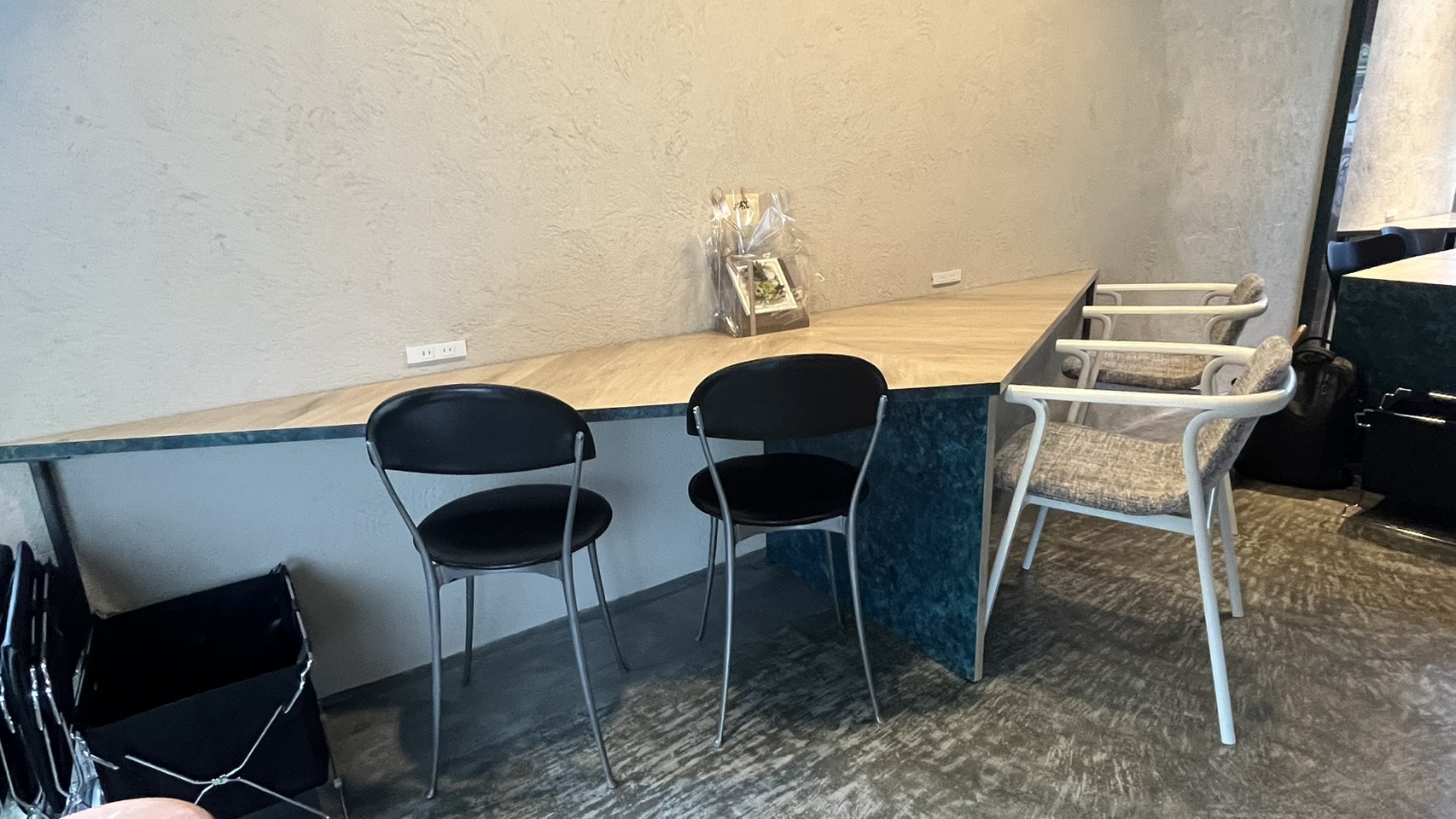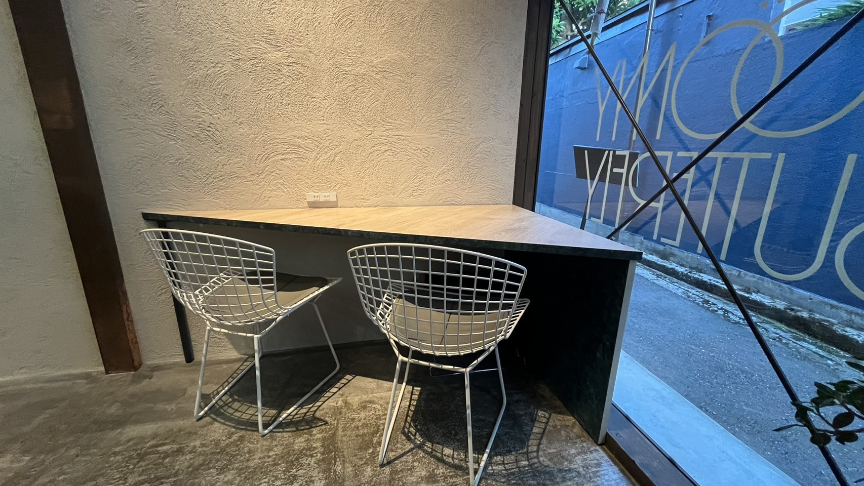 こちら入口前にも2席。よくみてみると、全部三角形のテーブルで面白いですね!また、椅子の種類もさまざまです。
