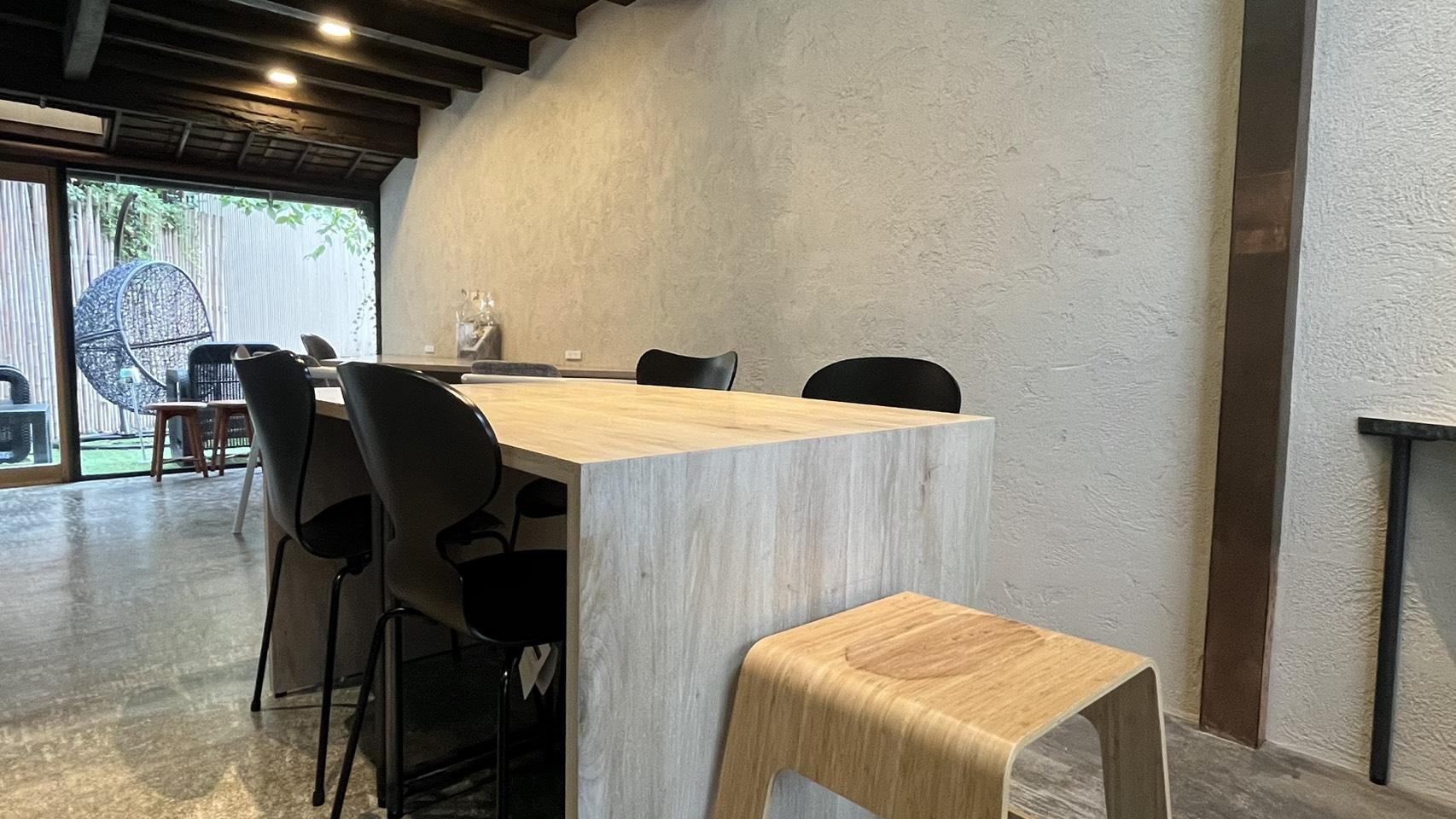 このカフェの空間は、「古民家×モダン×緑」という独創的なコンセプトで設計されています。伝統的な古民家の柱や梁を残しつつ、現代的なデザインと融合させることで、どこか懐かしくも新しい、洗練された雰囲気が漂っています。