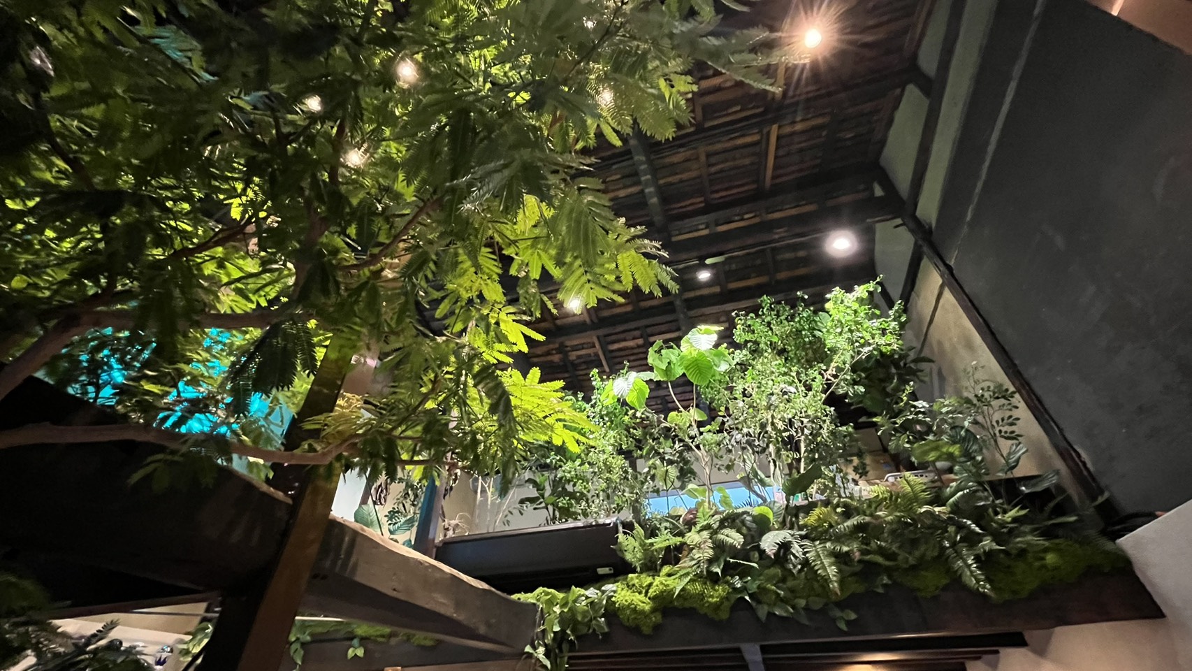 お店に入ると、まず目をひくのが高さ3.5mのシンボルツリー「エバーフレッシュ」です。この大きな木から始まる緑にあふれた空間は、まるで都会の喧騒を忘れるオアシス。深呼吸を誘うような穏やかなひとときを提供しています。