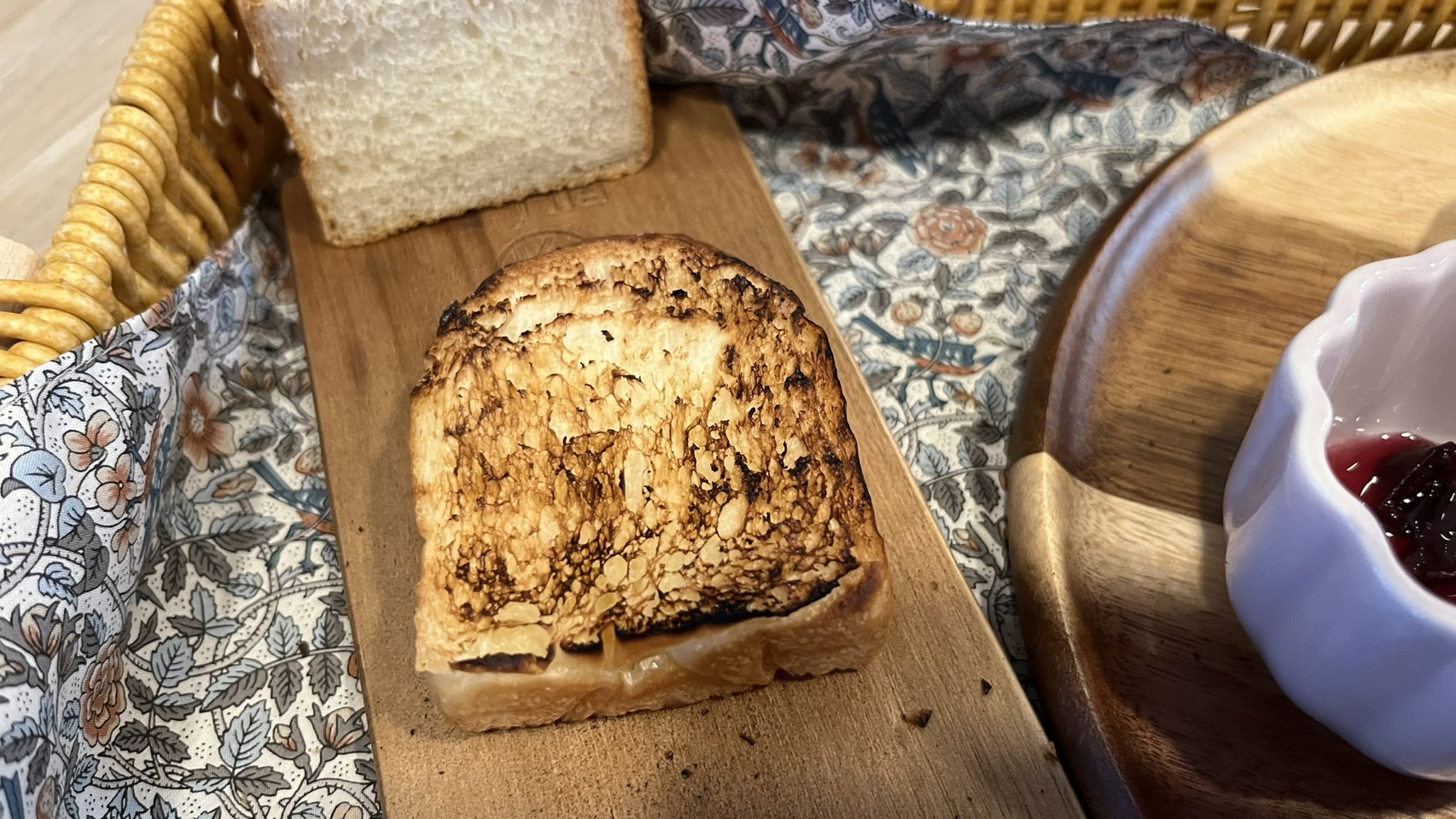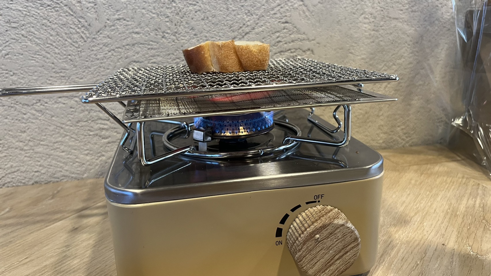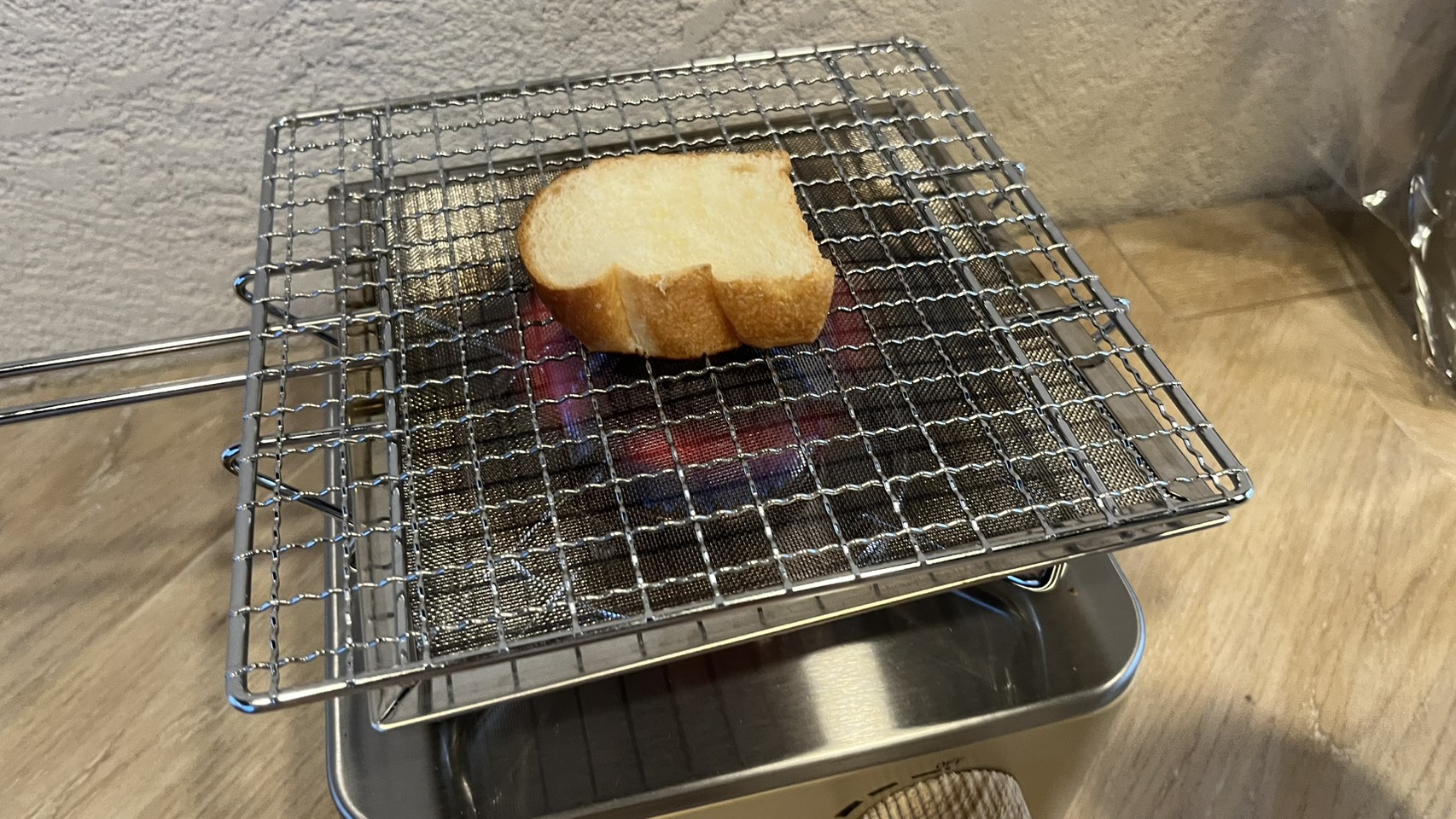 それは、「火を付けてしばらく待ち、コンロの回すところの目印で、弱い方から2つ目の目印の右端(1つ目の目印側)あたり、表面に赤い輪がある程度見える最低限度の火加減で、表裏をそれぞれ16〜18秒焼く(若干裏の焼く秒数多め)」こと。15秒では少し焼き足りず、20秒では焦げるという、この数秒の繊細な火加減こそが、最高の香ばしさとふわふわ感を引き出す鍵でした。ぜひ、皆さんもご自身で自分の焼き方を探してみてください。