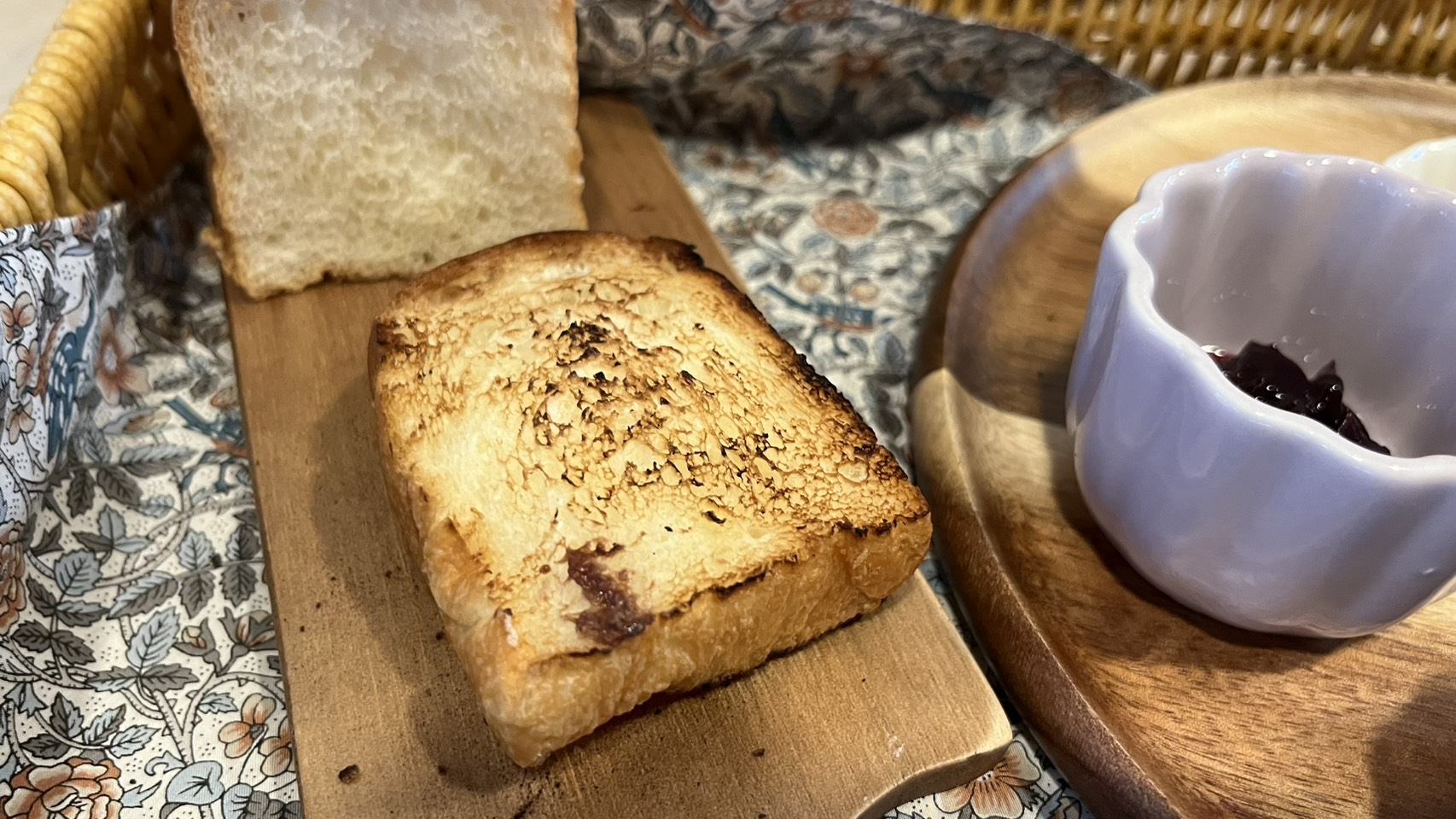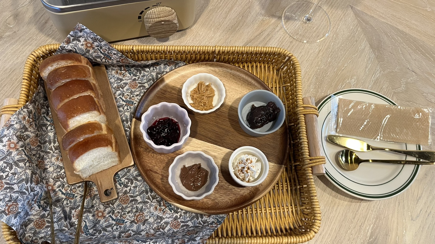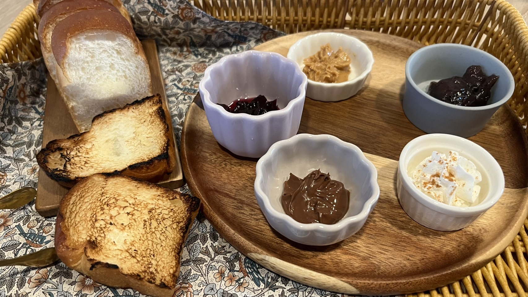 最高の焼き加減で仕上げたパンにトッピングを乗せて、いただきました。 ヌテラは、とろけるような滑らかな舌触りで、パンの風味を引き立てる最高の相性でした。定番のこしあんとピーナッツバターの組み合わせは、香ばしさと優しい甘さが絡み合い、誰もが納得の安心の美味しさです。そして、特に衝撃と感動を覚えたのがぶどうジャムです。ブドウの粒がしっかり入ったその味は、まるでワインのような複雑で上品な味わいで、ジャムの概念が変わるほどでした。