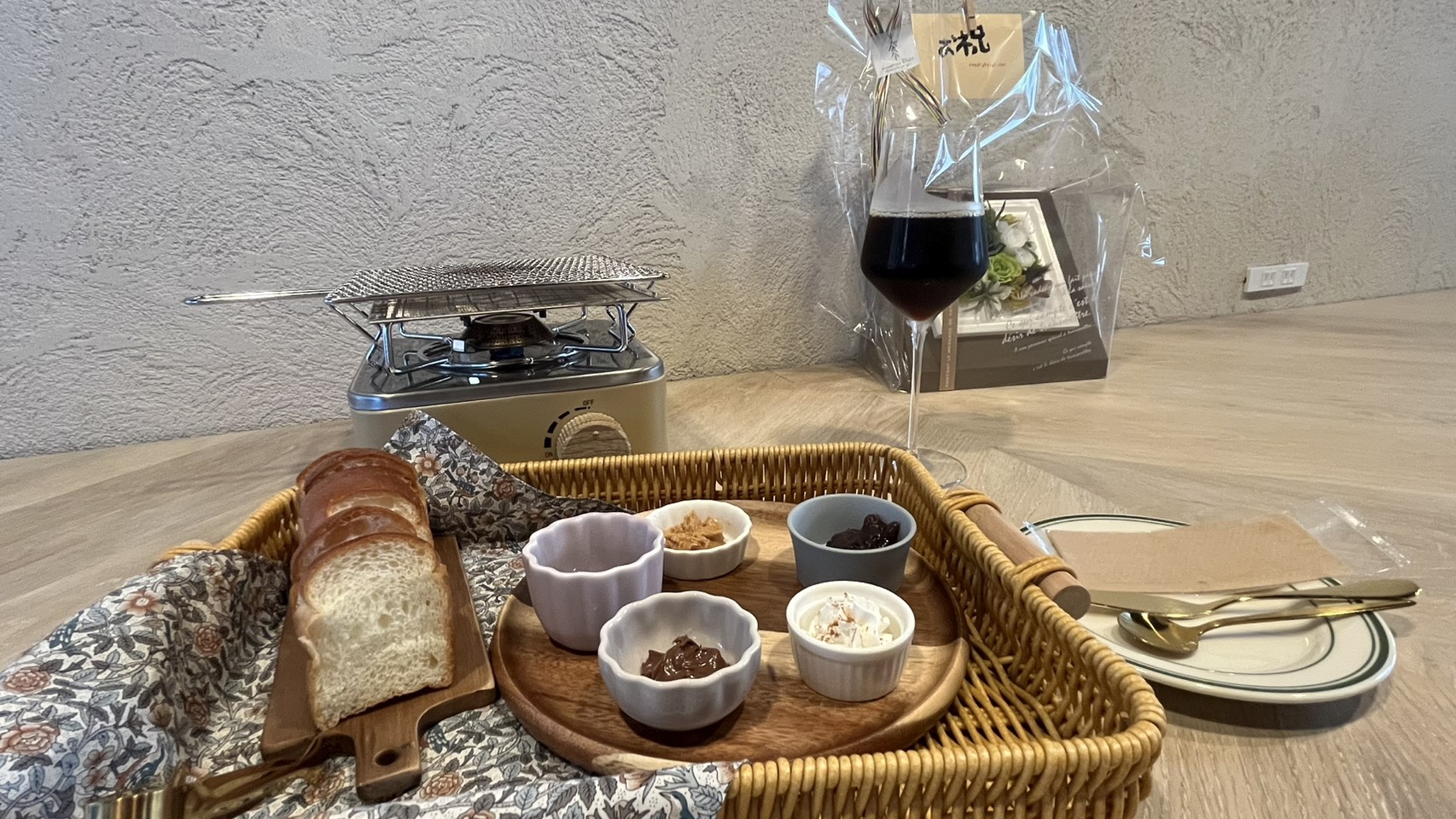 このメニューは、「ベーカリーパーラーGood Day」さんとコラボしたオリジナルのミニパン6枚とを、自分でガスコンロで焼いて楽しむスタイル。パンは手のひらサイズで、朝食、ブランチ、おやつなど、さまざまなシーンで気軽に利用することができます。