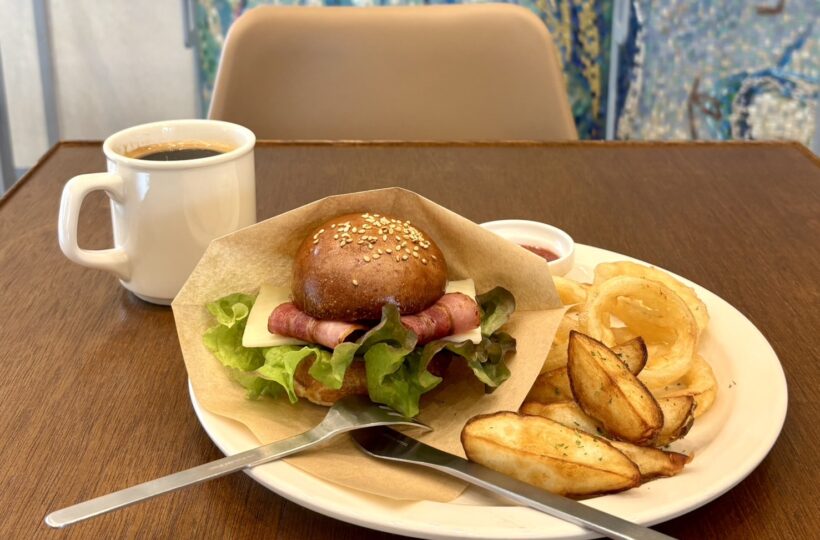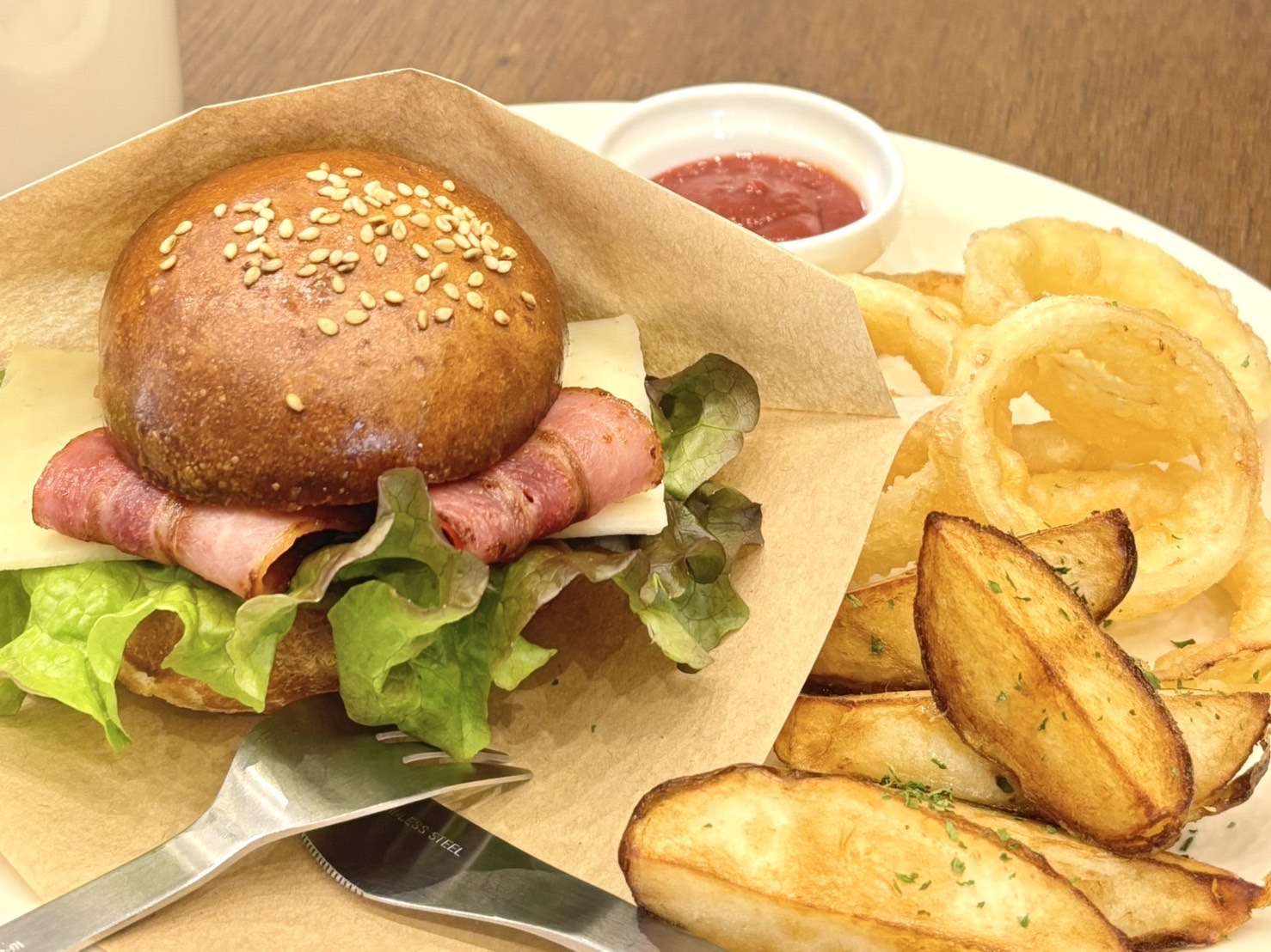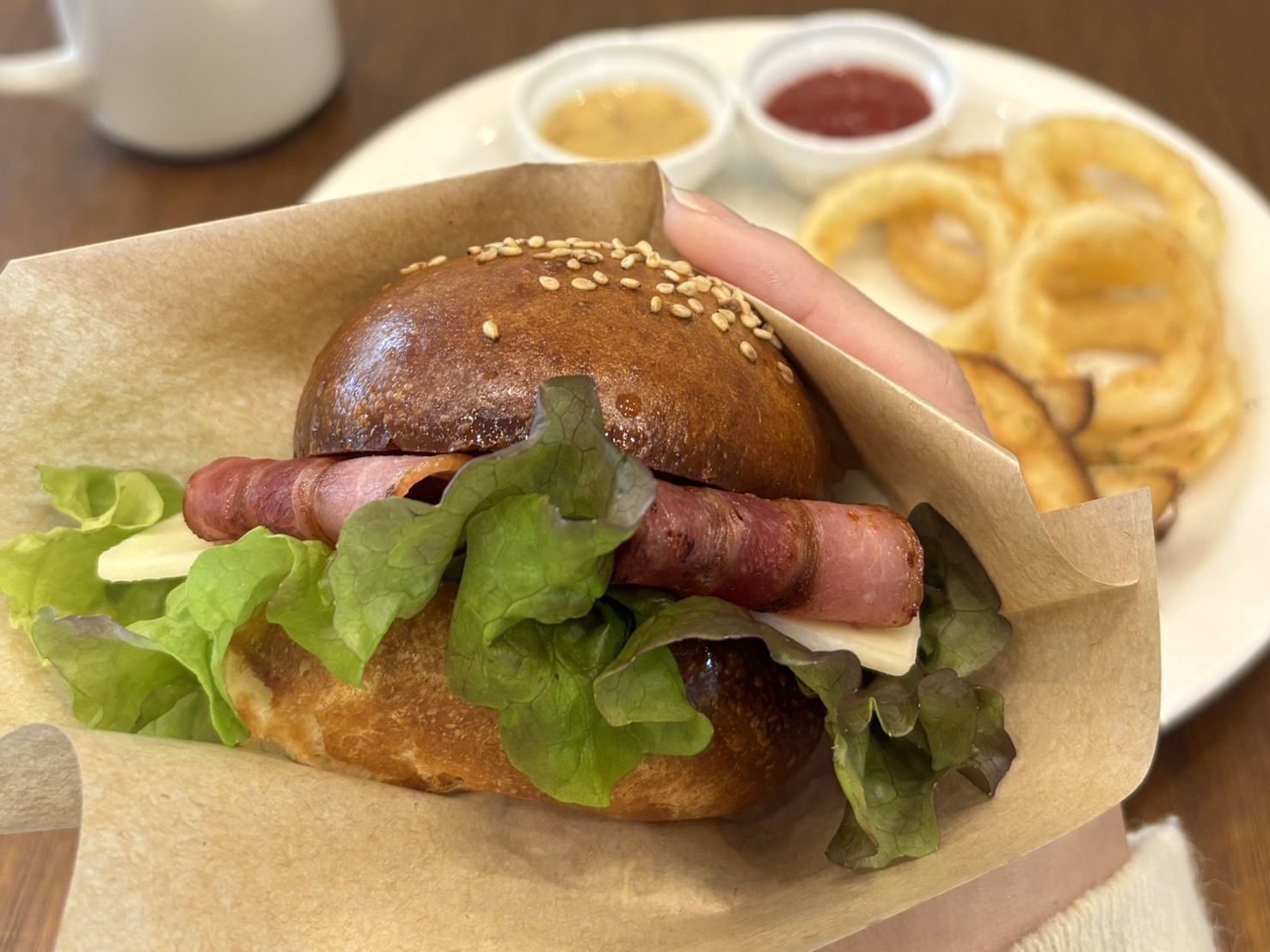 バンズから自家製ということがよく分かり、サイズは小ぶりでカフェの雰囲気にぴったり。軽食にも最適で程よい満足感です。