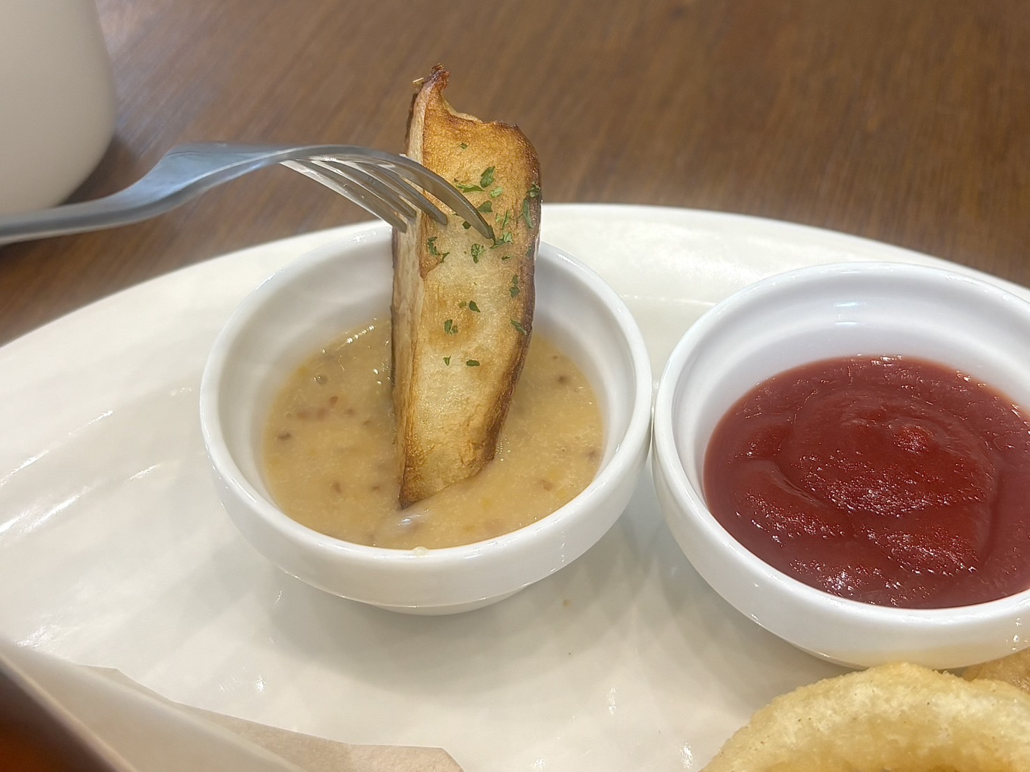 オニオンリングもフライドポテトも甘みがしっかり感じられて美味しい。