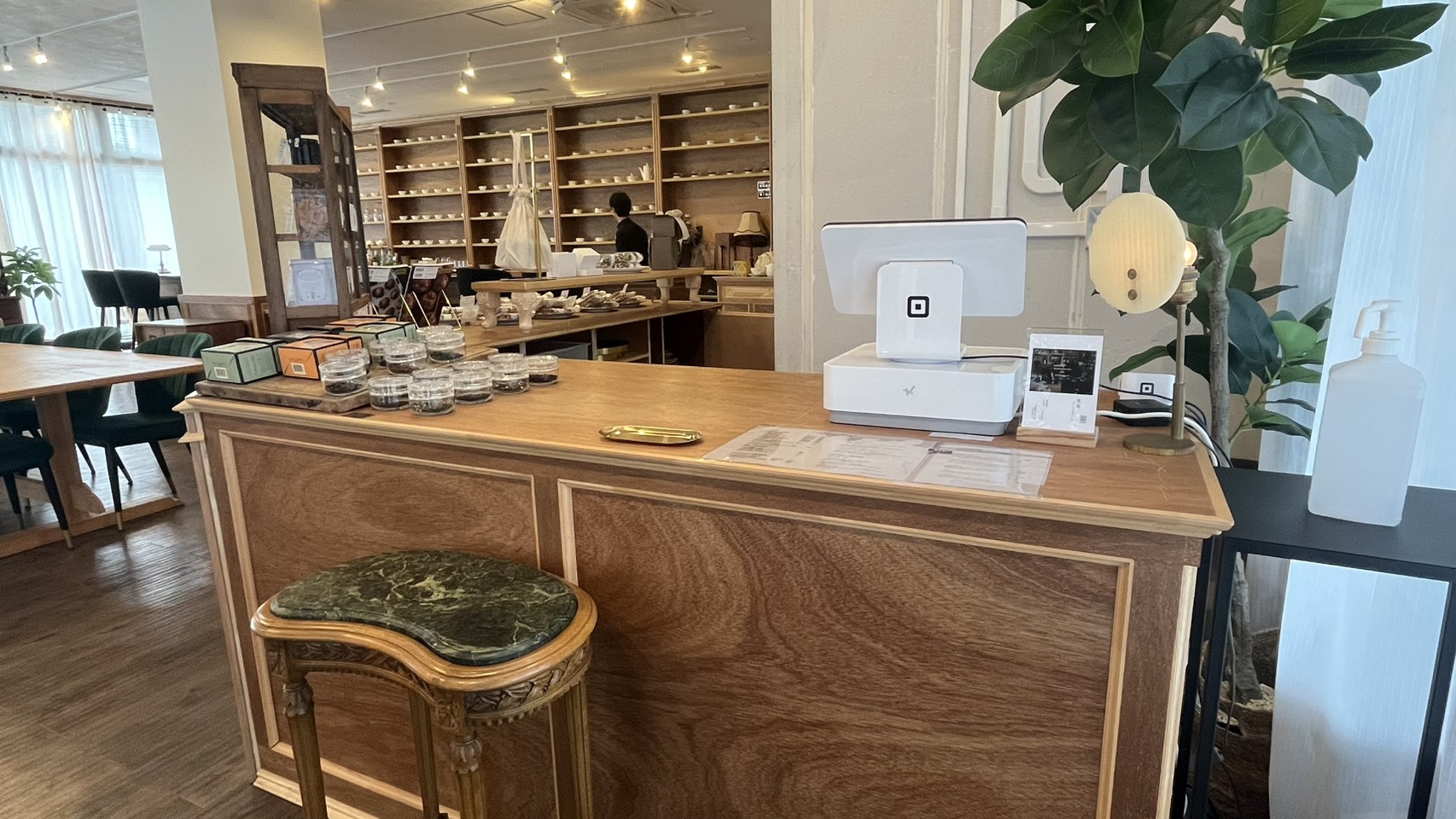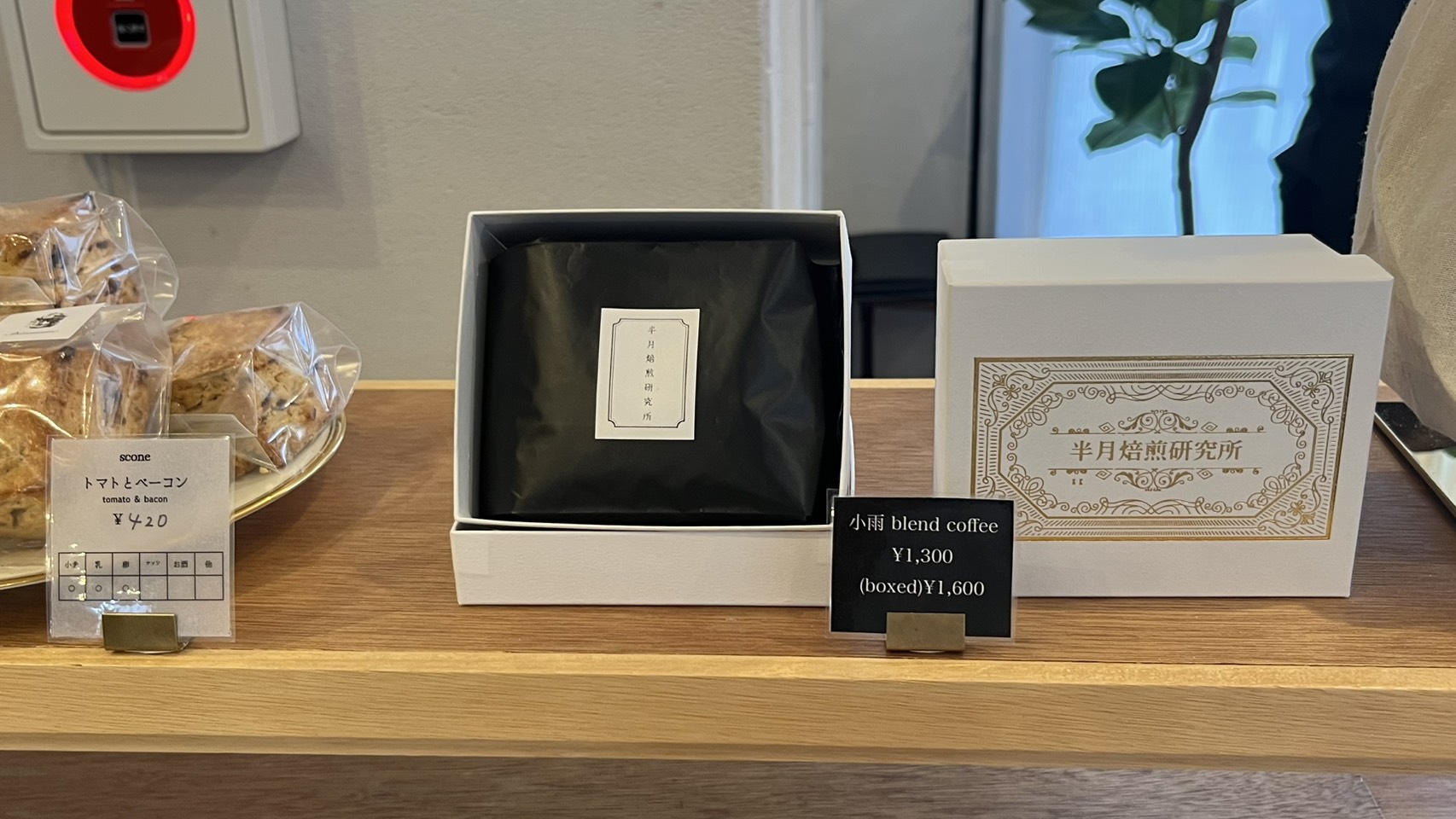 帰り際にレジカウンターを見てみると、たくさんのお茶やお菓子がありました。国内外から厳選されたお茶に加え、金沢にはコーヒー好きなお客様が多いことから、「半月焙煎研究所」さんの豆を使用したコーヒーも用意されています。