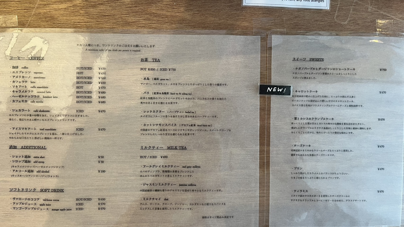 今回頼んだときのメニュー表