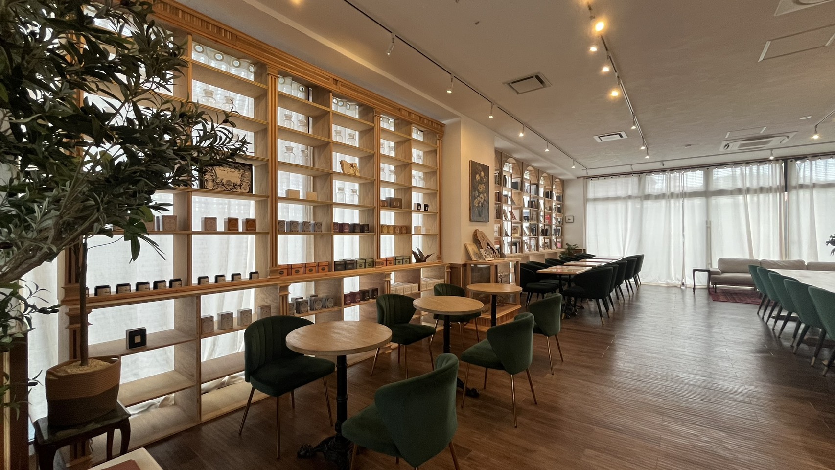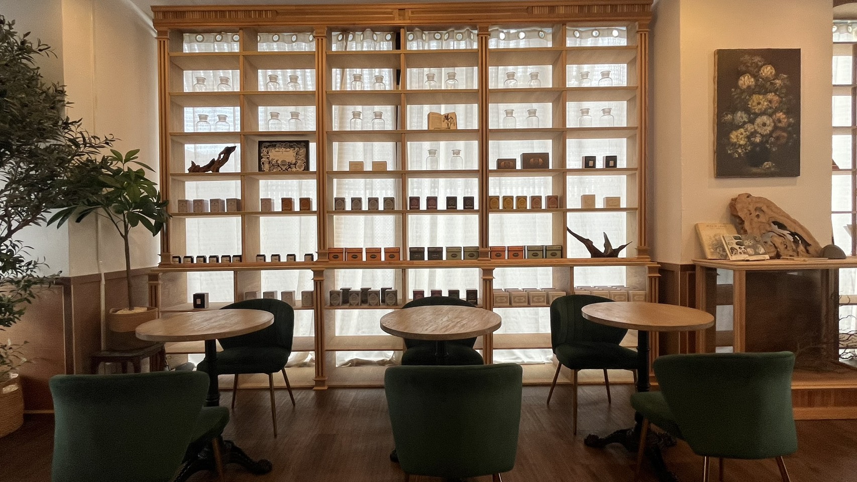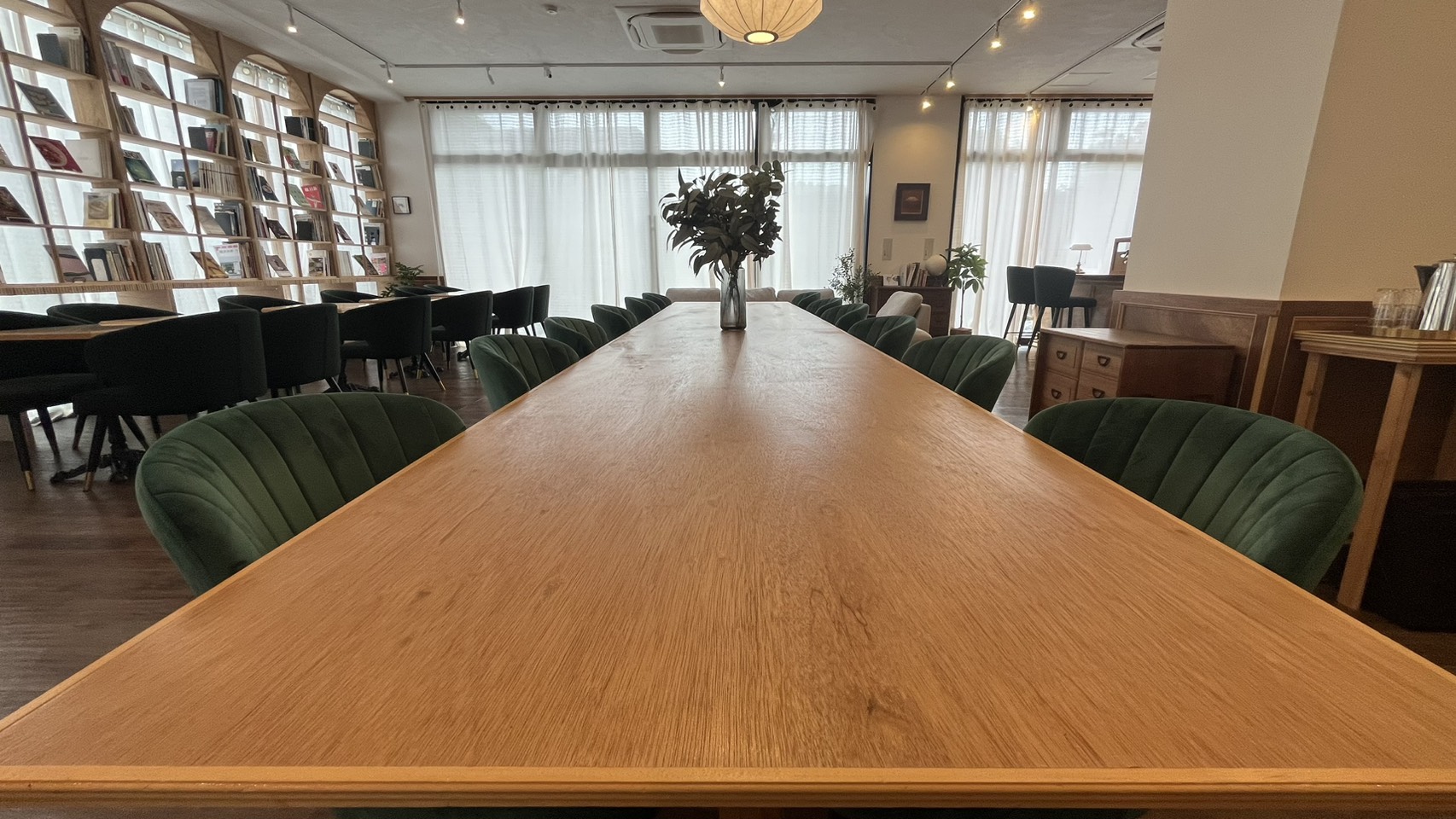 アンティークの家具や調度品が配された空間は、時間の流れをゆるやかに感じさせ、訪れる人を優しく包み込みます。特に印象的なのは、大きな窓からたっぷりと差し込む柔らかな光。白を基調とした壁とシンプルな内装に自然光が降り注ぎ、空間全体に温かく落ち着いた雰囲気をもたらしています。