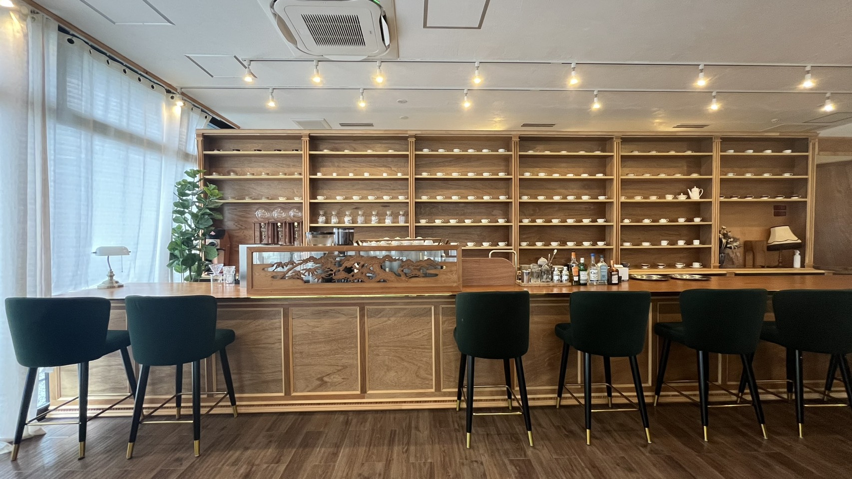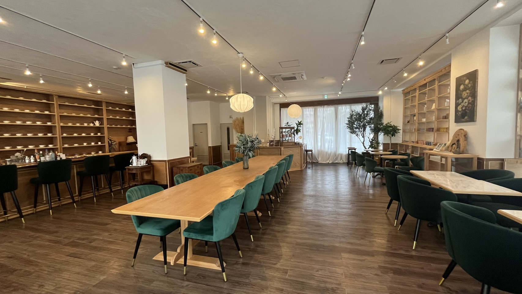 店内に1歩足を踏み入れると、外観とのギャップに驚かされます。そこには、洗練された「小雨」の世界が静かに広がっているからです。椅子は緑で統一され、テーブルやカウンターは木のぬくもりを体感できるようなつくりになっています。