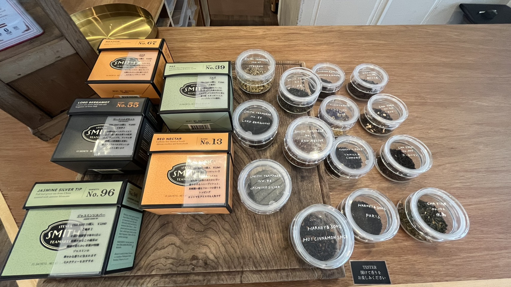帰り際にお茶を家で楽しもうと思い、下に目をやるとたくさんの茶葉が並んでいました。