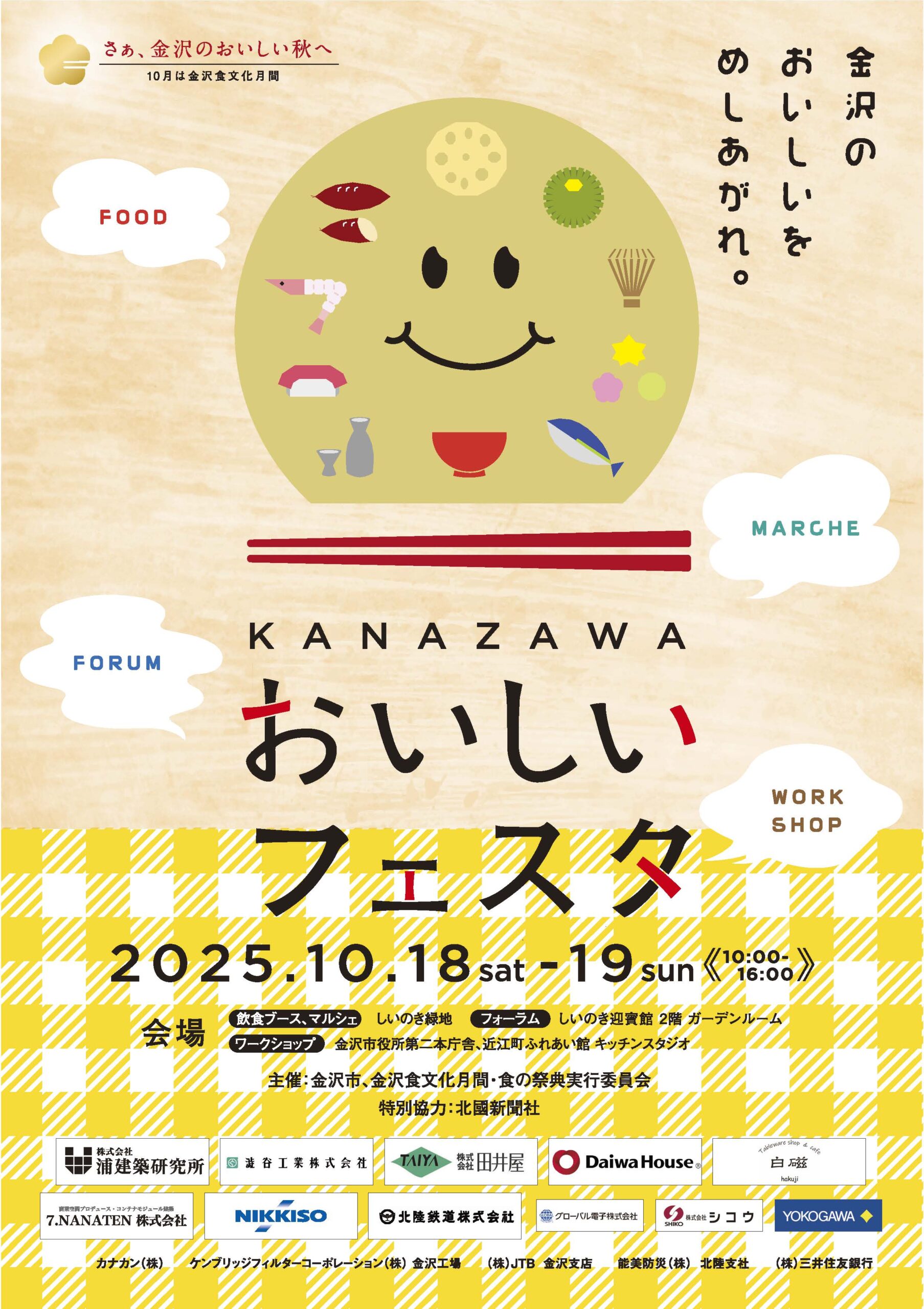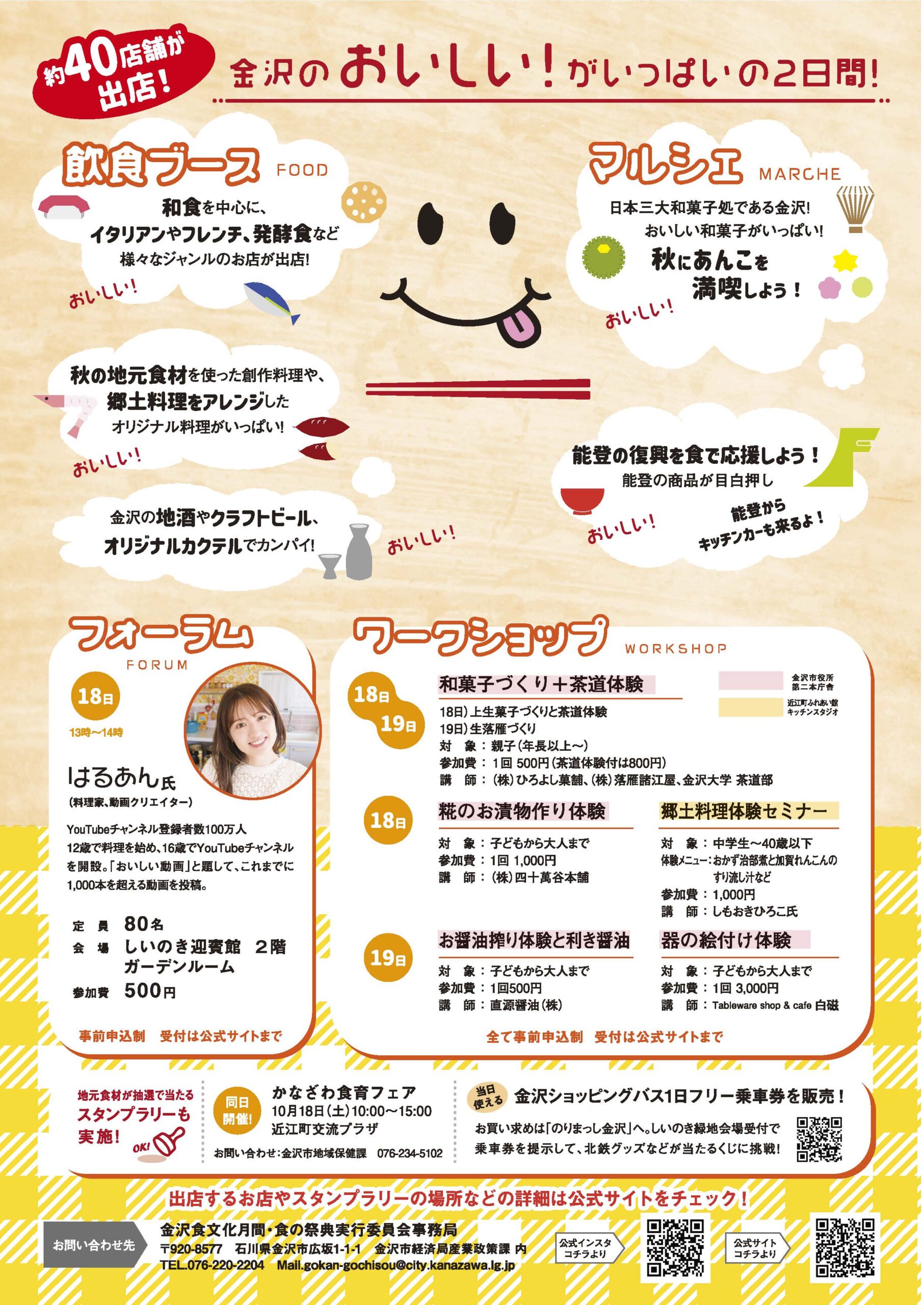 入場料:無料(※飲食・ワークショップ・フォーラムは有料)主催:金沢市、金沢食文化月間・食の祭典実行委員会事務局