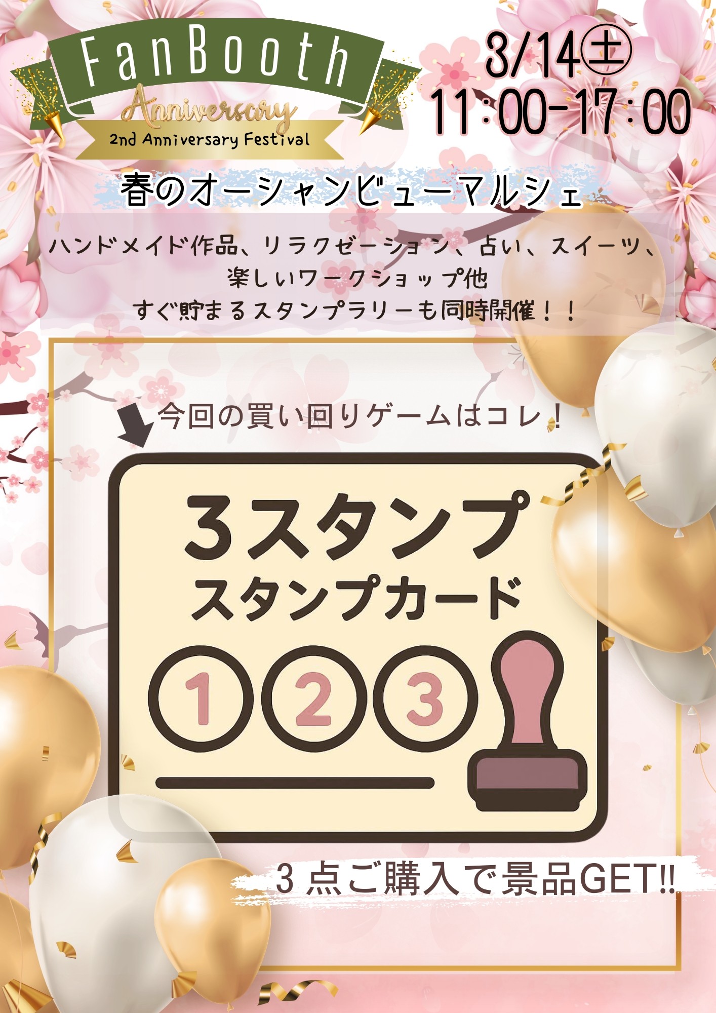 ハンドメイド&雑貨の「FanBooth」さん2周年のイベント。ハンドメイド、ワークショップ、占いやスイーツなど、盛りだくさんの内容です。買い回りゲームも楽しめますよ。