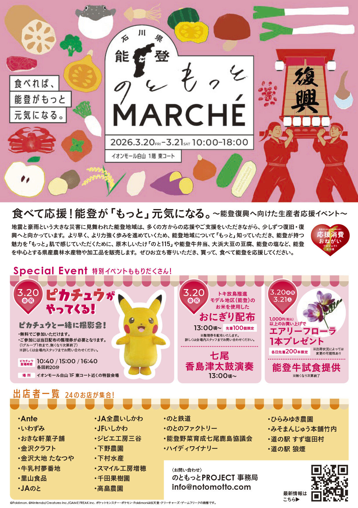 買って、食べて、能登を応援しましょう! 3月20日にはピカチュウが来てくれますよ。