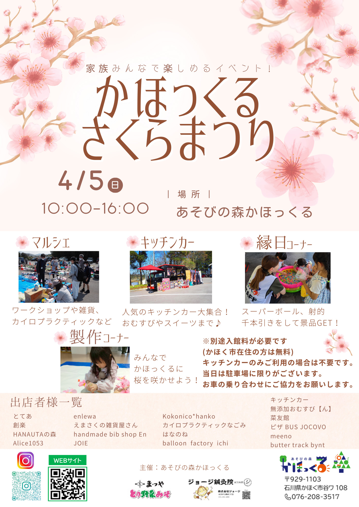 春のかほっくるは桜で満開! かほっくるの中ではマルシェやプチ縁日、お外ではキッチンカーが大集合! 桜もかほっくるも満喫しよう♪