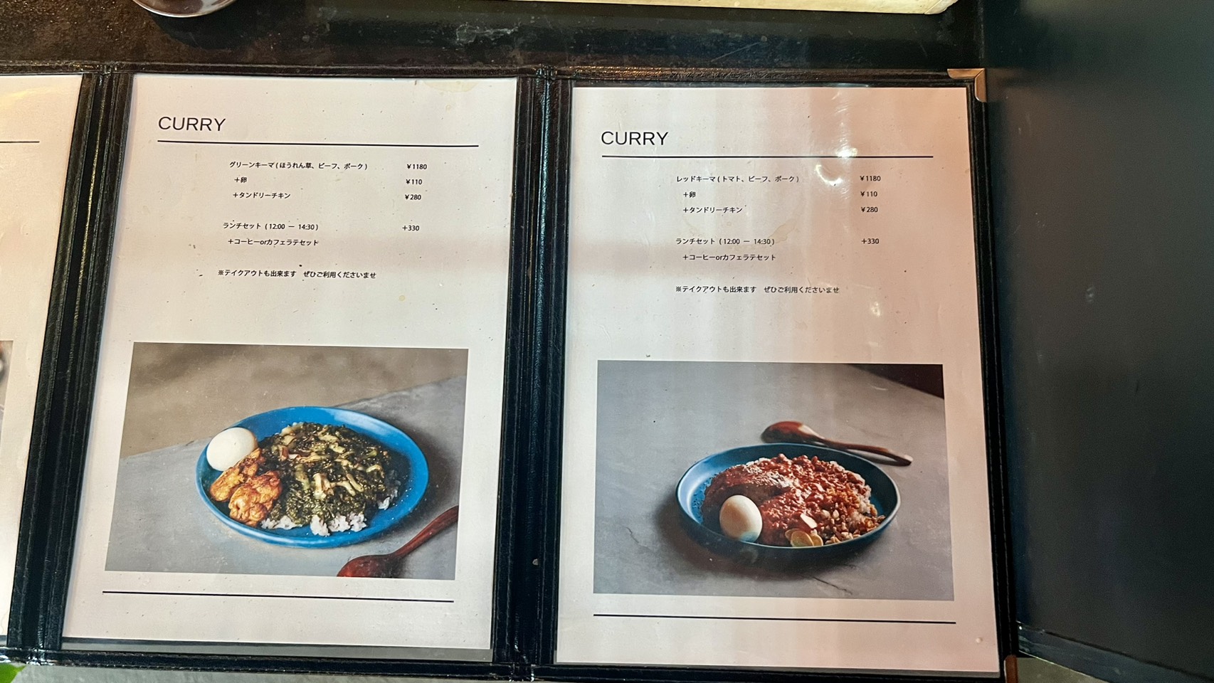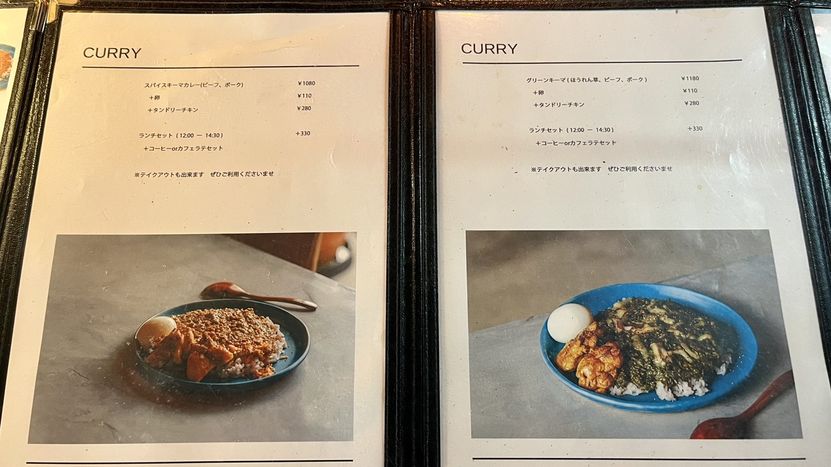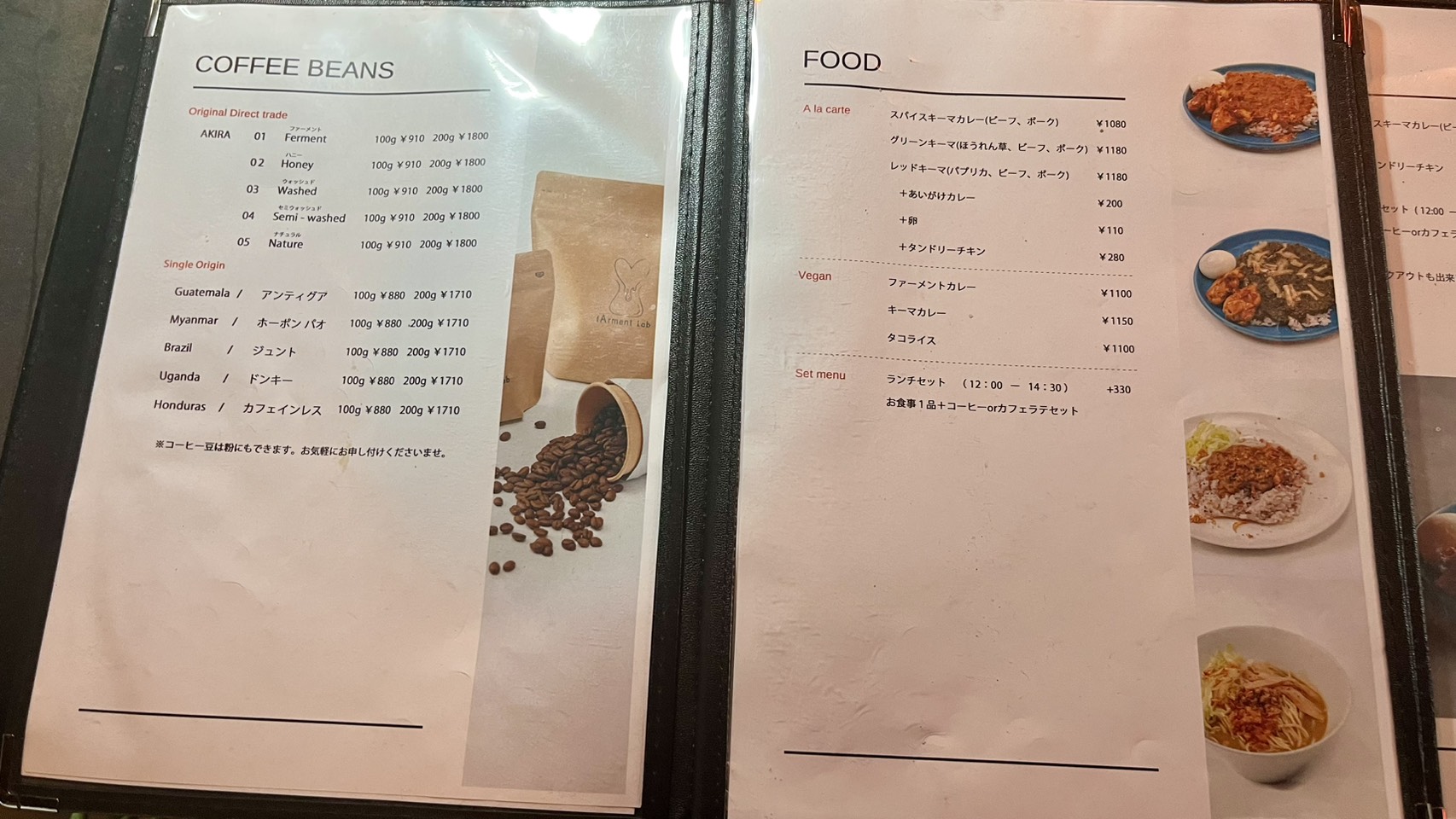 まずはFOOD 左ページがコーヒー豆、右ページの上段がキーマカレー、中段がヴィーガンカレー、下段がセットで+330円でお得にドリンクが楽しめます!