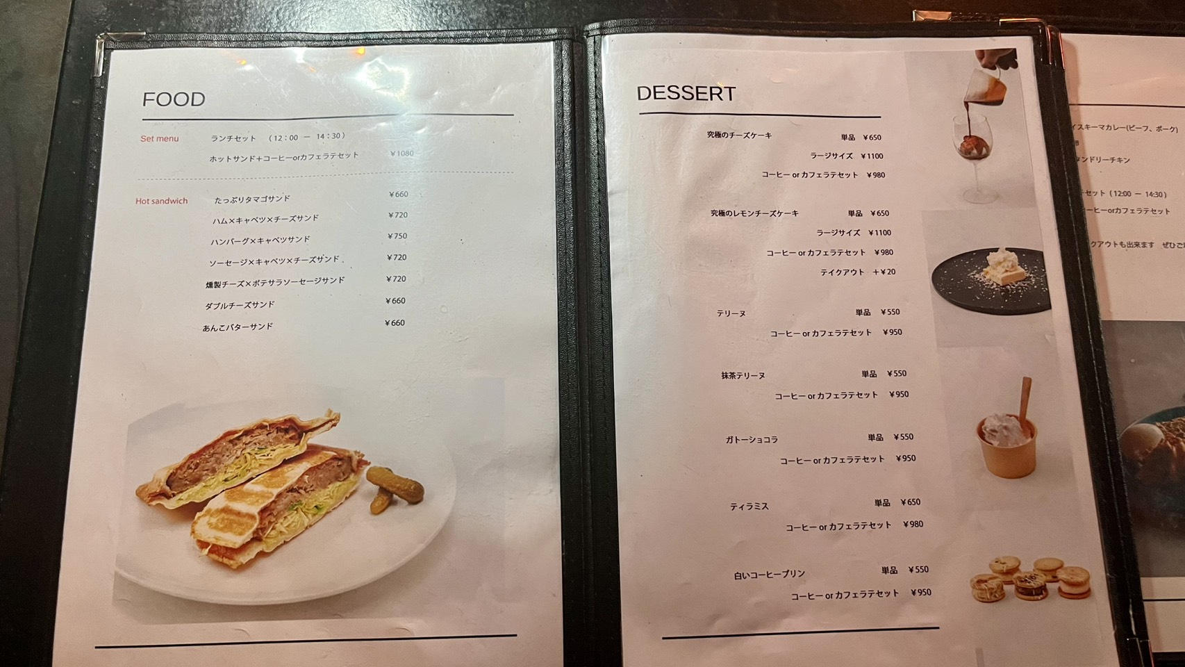 続いて、美味しそうなホットサンドとデザートたち。ここのお店で有名なのは究極のチーズケーキ。