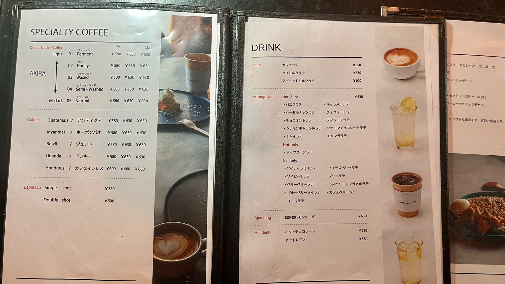 最後にドリンクメニュー。左ページはスペシャルティコーヒー、右ページはアレンジドリンク。スペシャルティコーヒーで10種類、ラテだけでなんと23種類、両方ともラインナップが充実しているお店は珍しいですね。