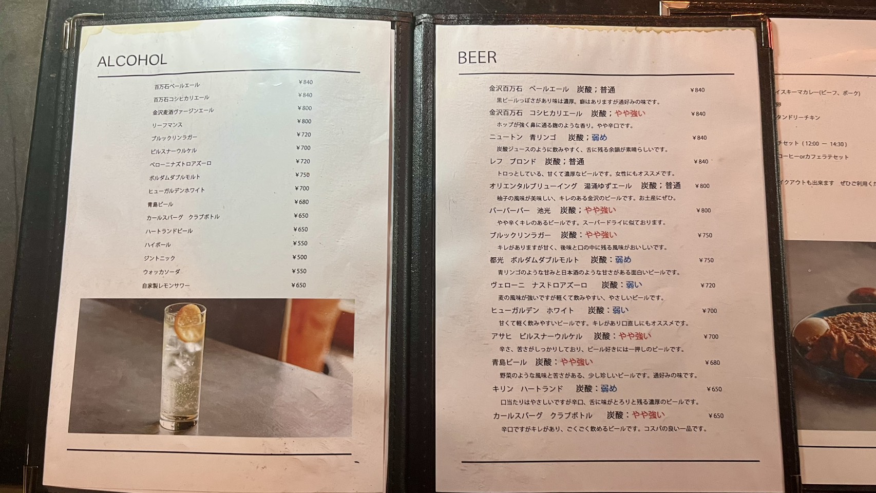 夜カフェ向けのアルコールも充実しています。炭酸の強度が書かれていたり、味のコメントがあるとすごく選びやすいですよね。いつも車で行くため、飲む機会はなかなかないですが、良いですね。