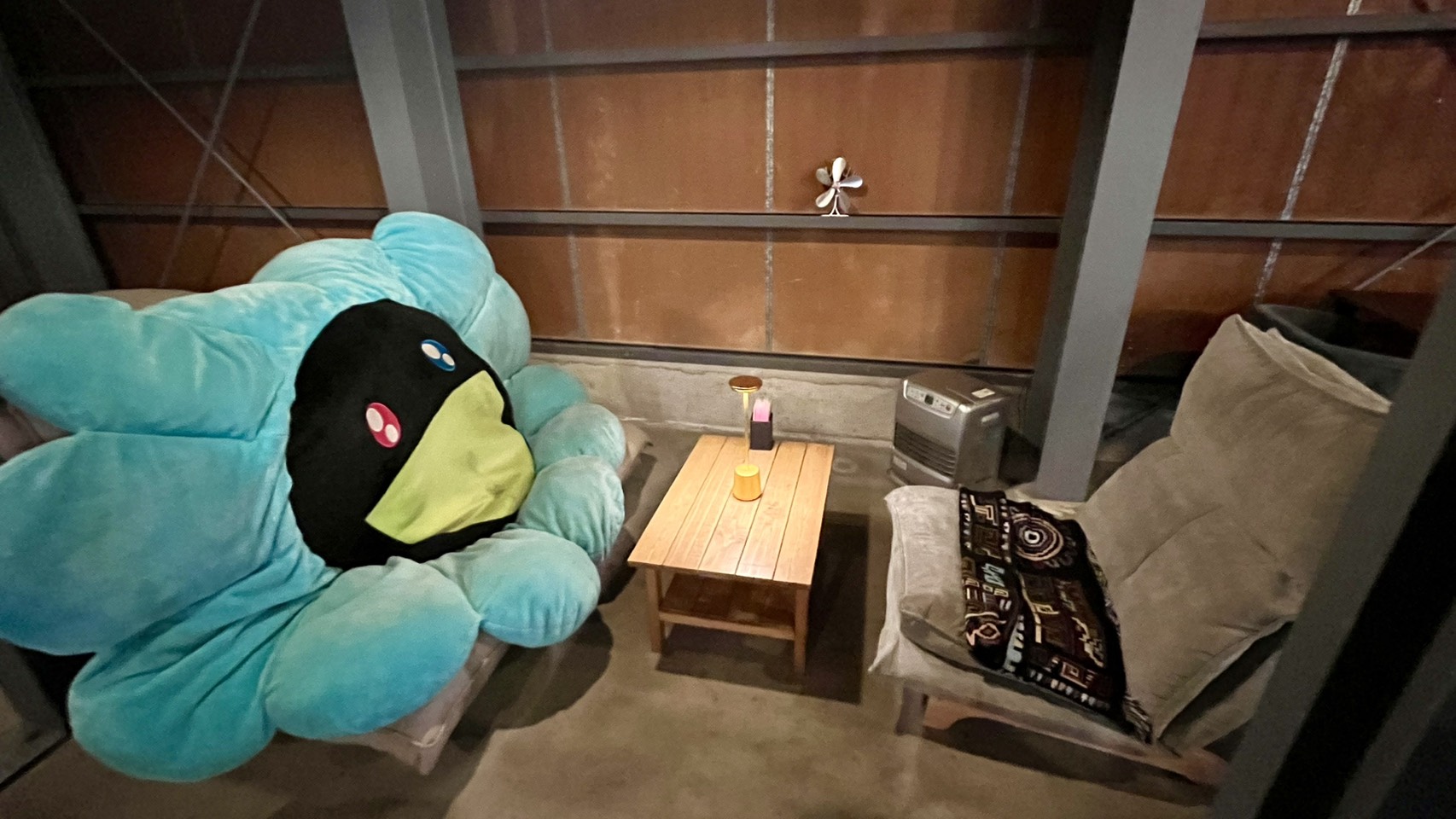 個人的にお気に入りの席がこちら。青いキャラクターのようなこのクッションが本当に好きです。デザインが可愛いのはもちろん、背もたれが広々としているから身体全体が包み込まれる感じで、目を閉じて夢見心地を感じるくらいリラックスできます。