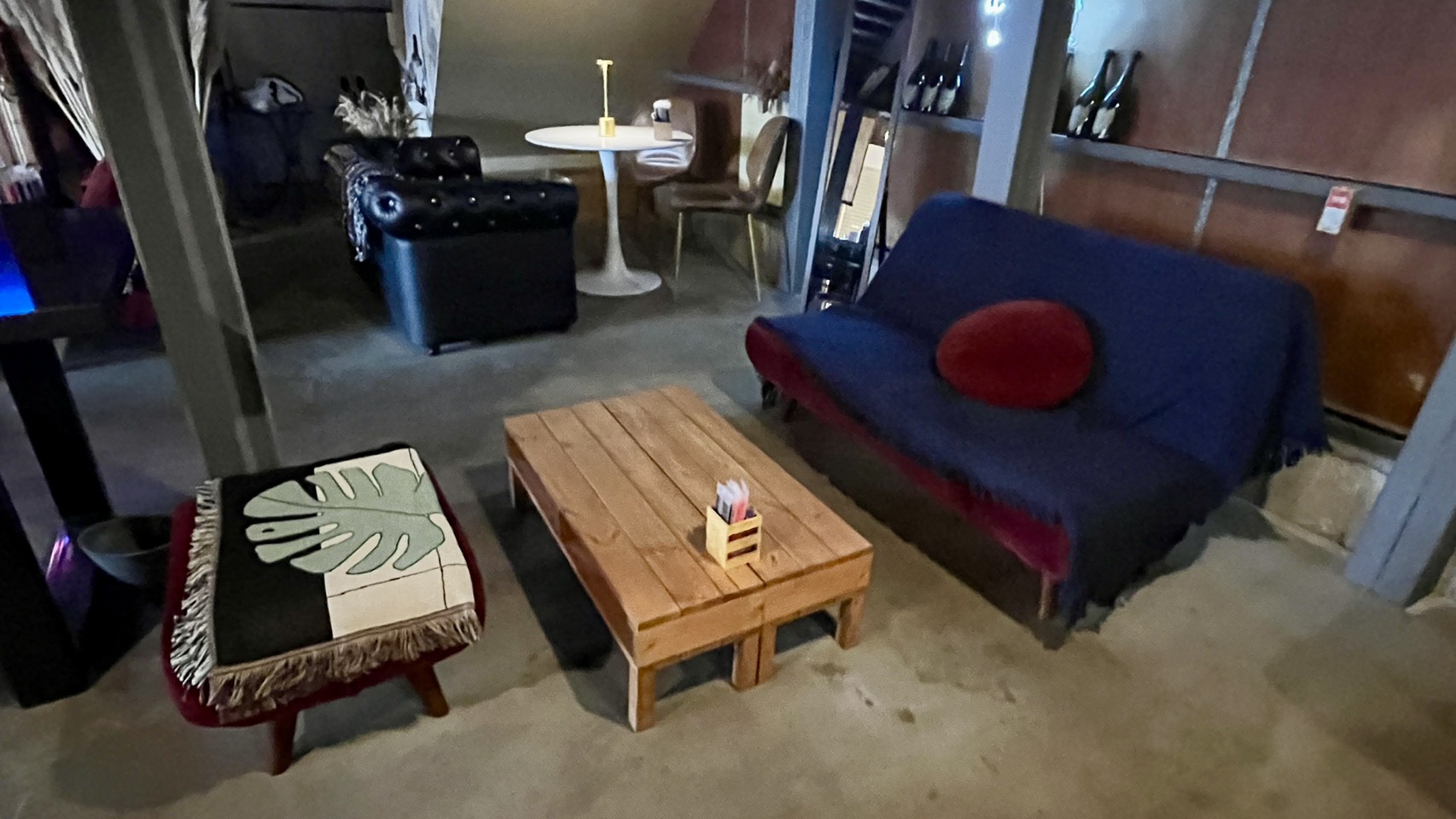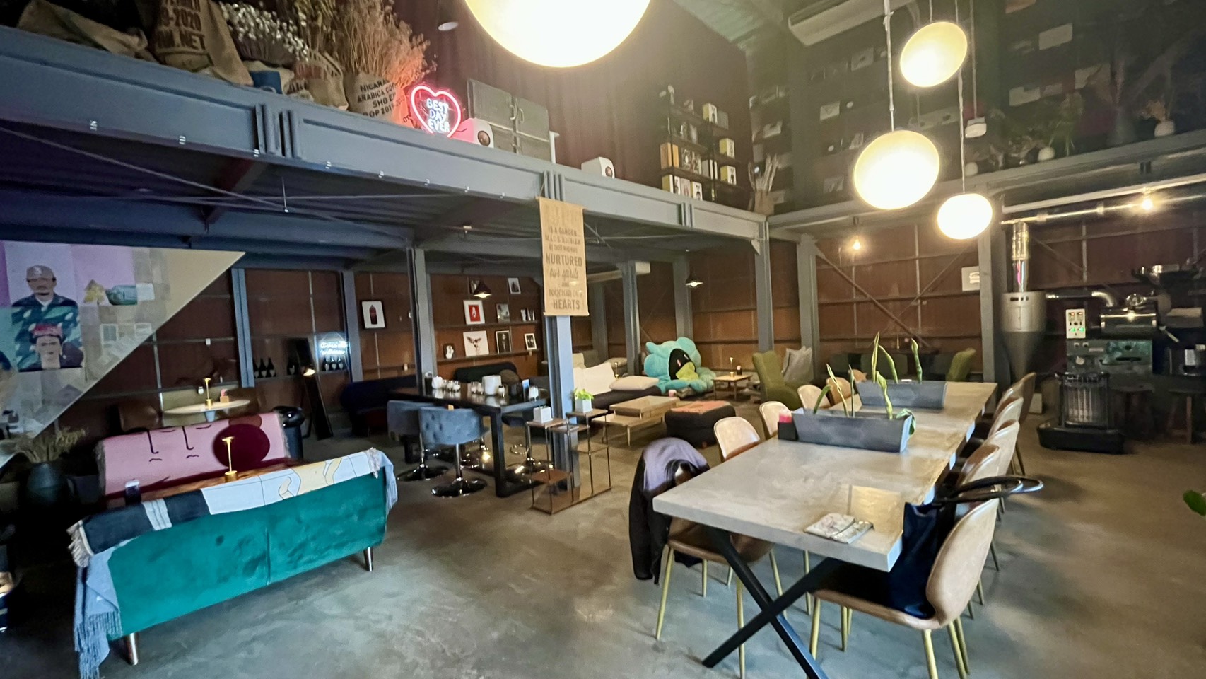 天井が高くて開放感のある空間。倉庫のイメージから一気に海外の街に迷い込んだような感覚になります。訪れるたびに、この空間の心地よさを感じています。