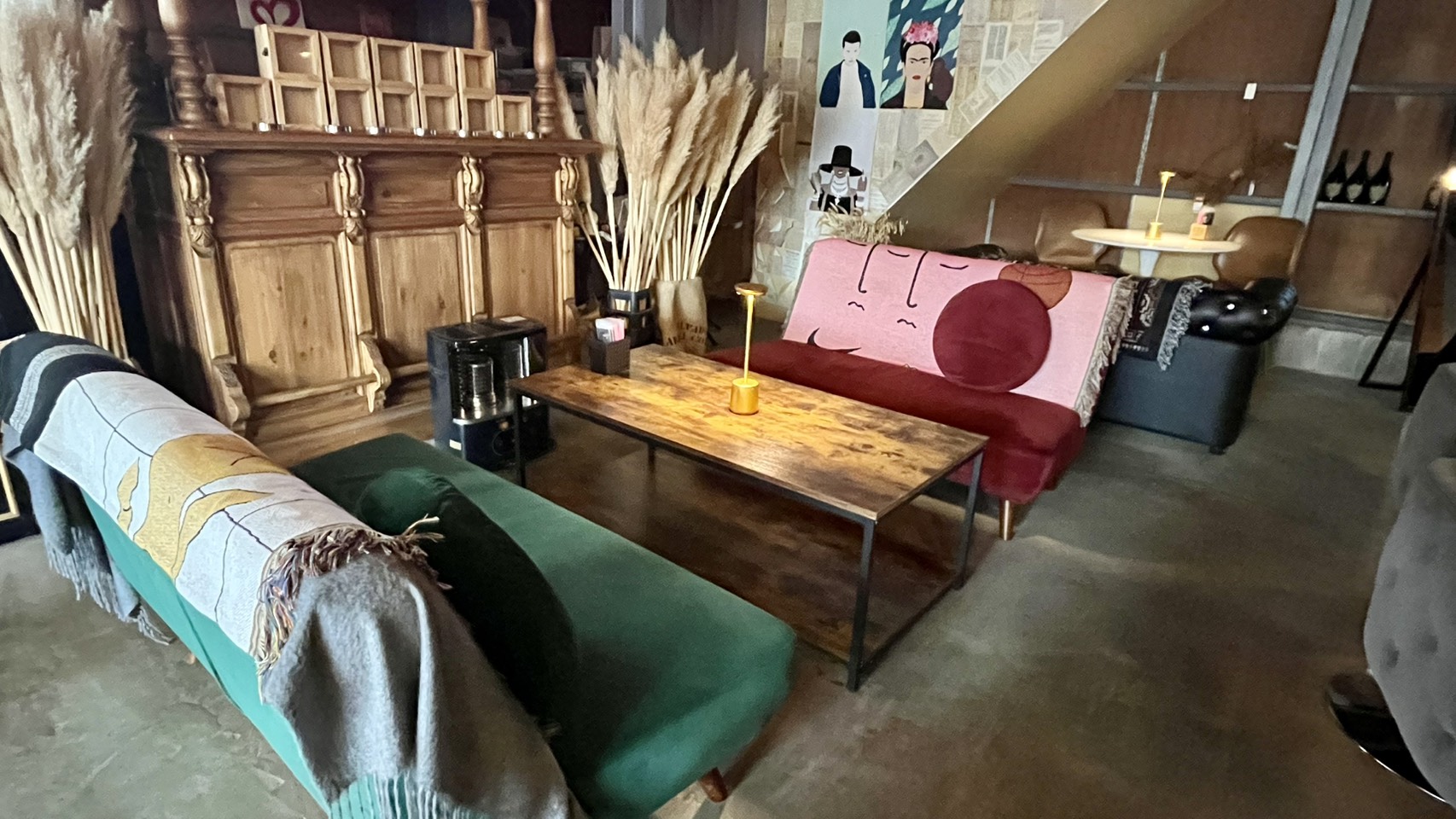 食事も様々なバックグラウンドの方々が楽しめるラインナップであり、また時間帯を気にせず、ペットを連れても気軽に来られる場所。多種多様な家具が配置され、席ごとに異なる雰囲気を楽しめる空間。共同開業者の方の趣味で集められた本物の絵画やアート作品。