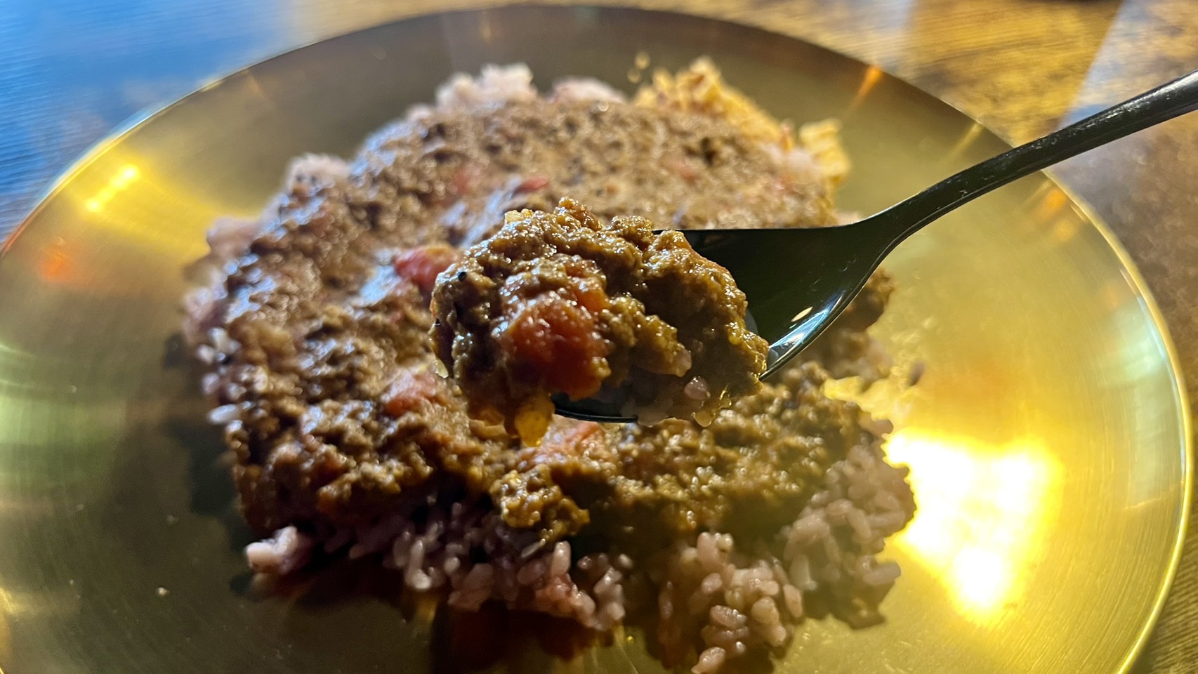 ひとくち食べると、スパイスの複雑な味わいとトマトの酸味、そしてお肉の旨味が口いっぱいに広がります。辛すぎず、絶妙なバランスです。野菜の甘みも感じられて、お肉の旨味と見事に調和しています。