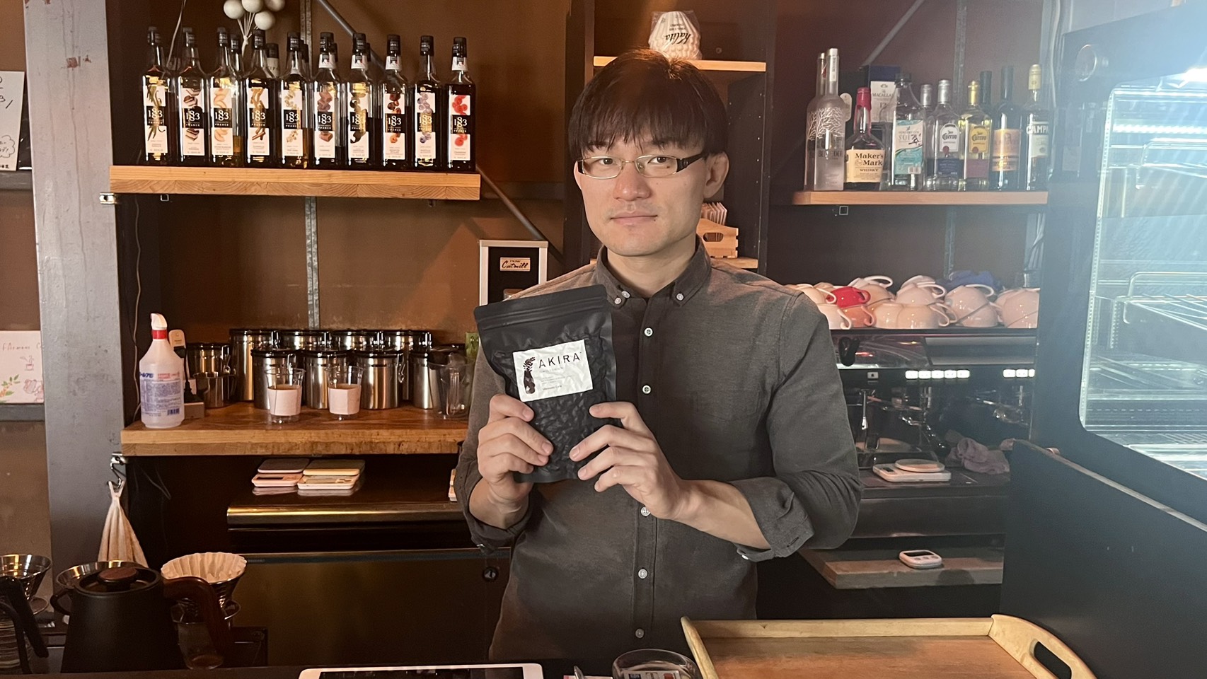 「このコーヒー豆、『AKIRA』っていうんですけど、日本でうちでしか扱ってないんです」