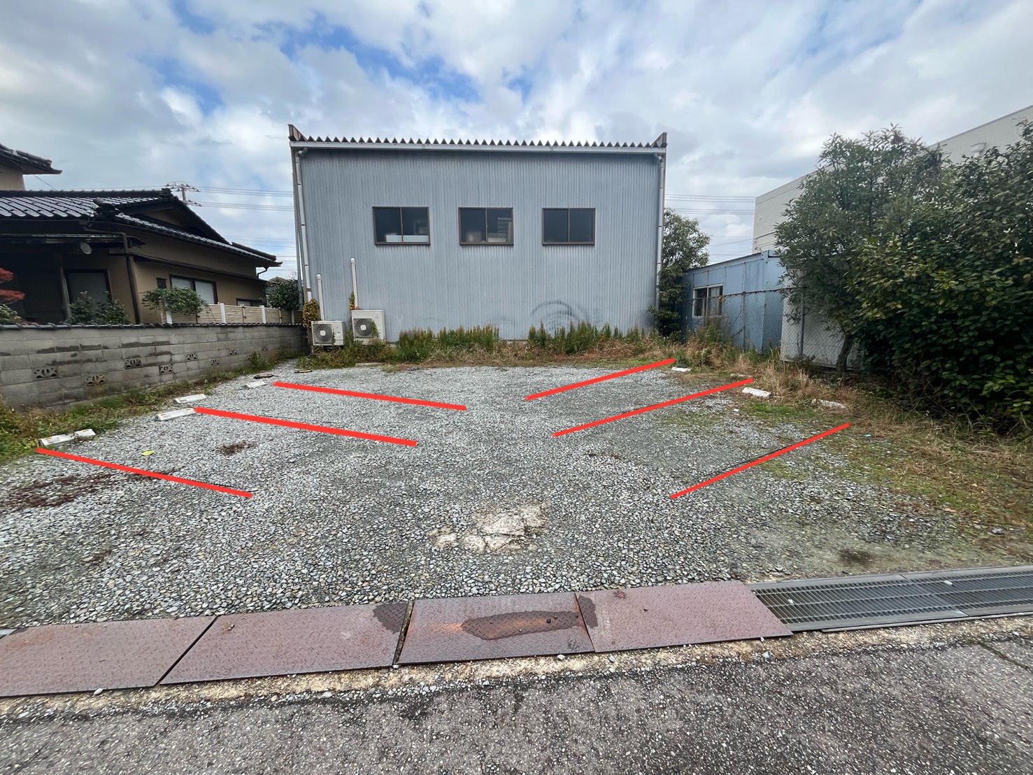 最初は少し見つけにくいかもしれませんが、砂利に引かれたロープ(赤線で補足)で仕切られていて、左右にそれぞれ4台ずつ、合計8台停めることができます。今では裏の駐車場の存在を知っているので、表が満車でも焦らずに済みます。これからお越しの方も、ぜひ覚えておいてください。