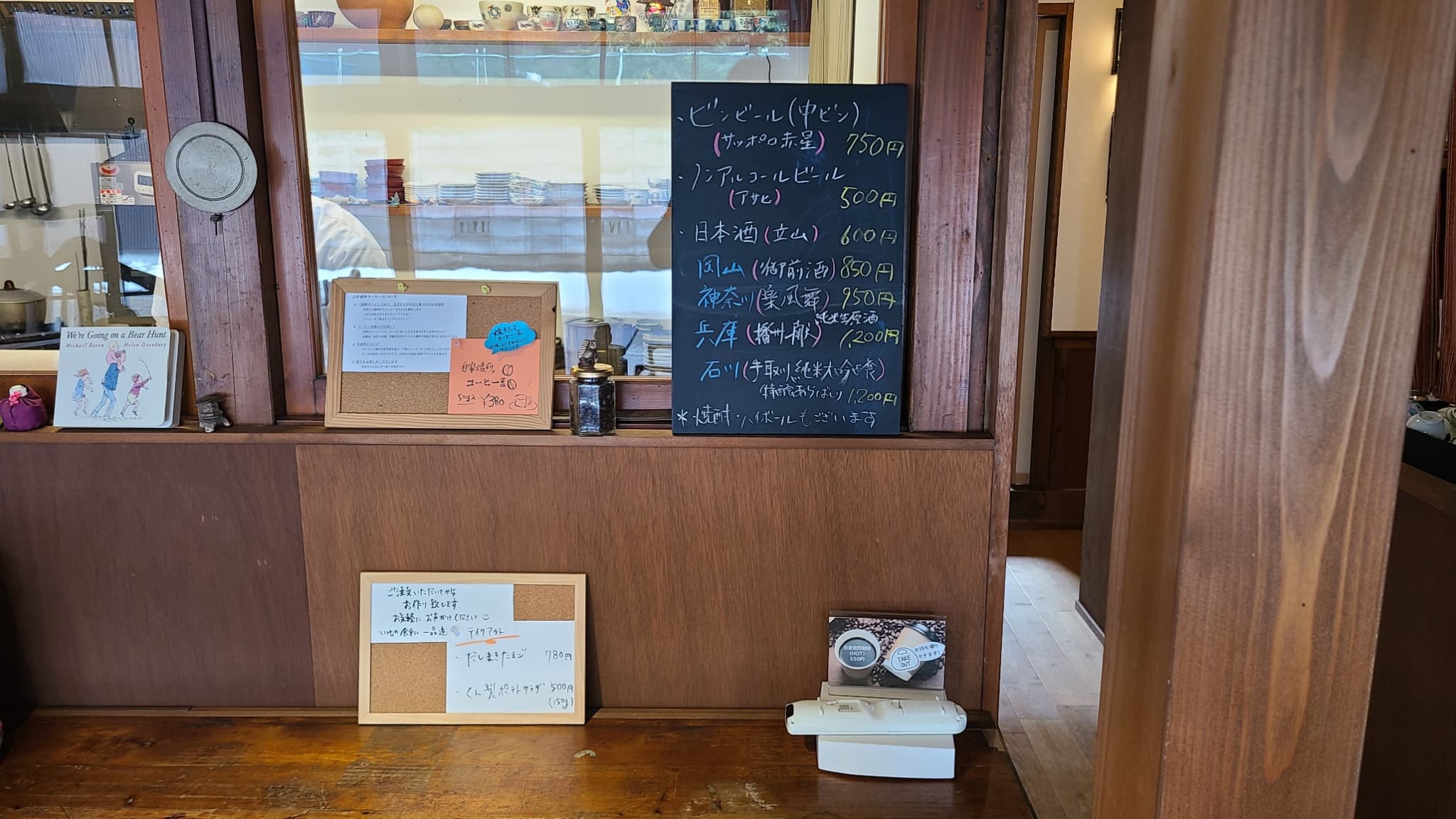 さらに、カウンターの黒板にはお酒の品揃えや1品料理の案内も。