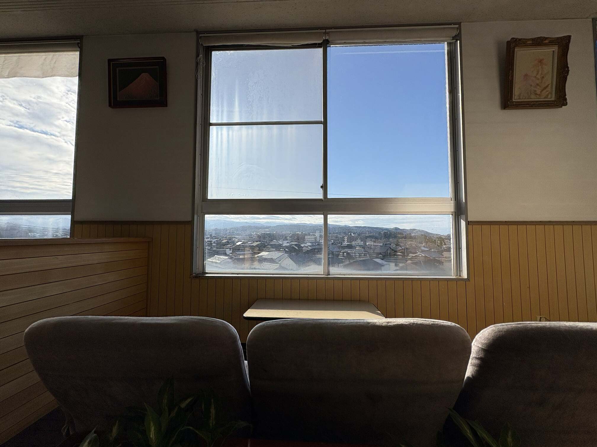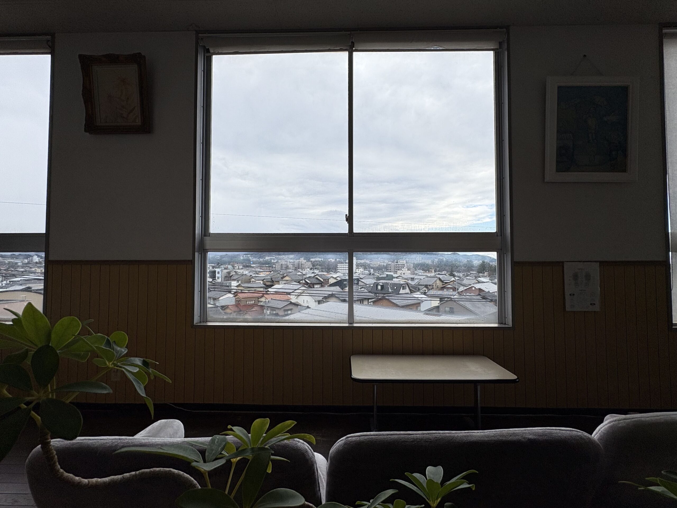 3階のロビーの窓からは、犀川流域の家並みや周辺の山々を一望できる。とても気持ちが良くついつい景色に見とれて長居してしまう。