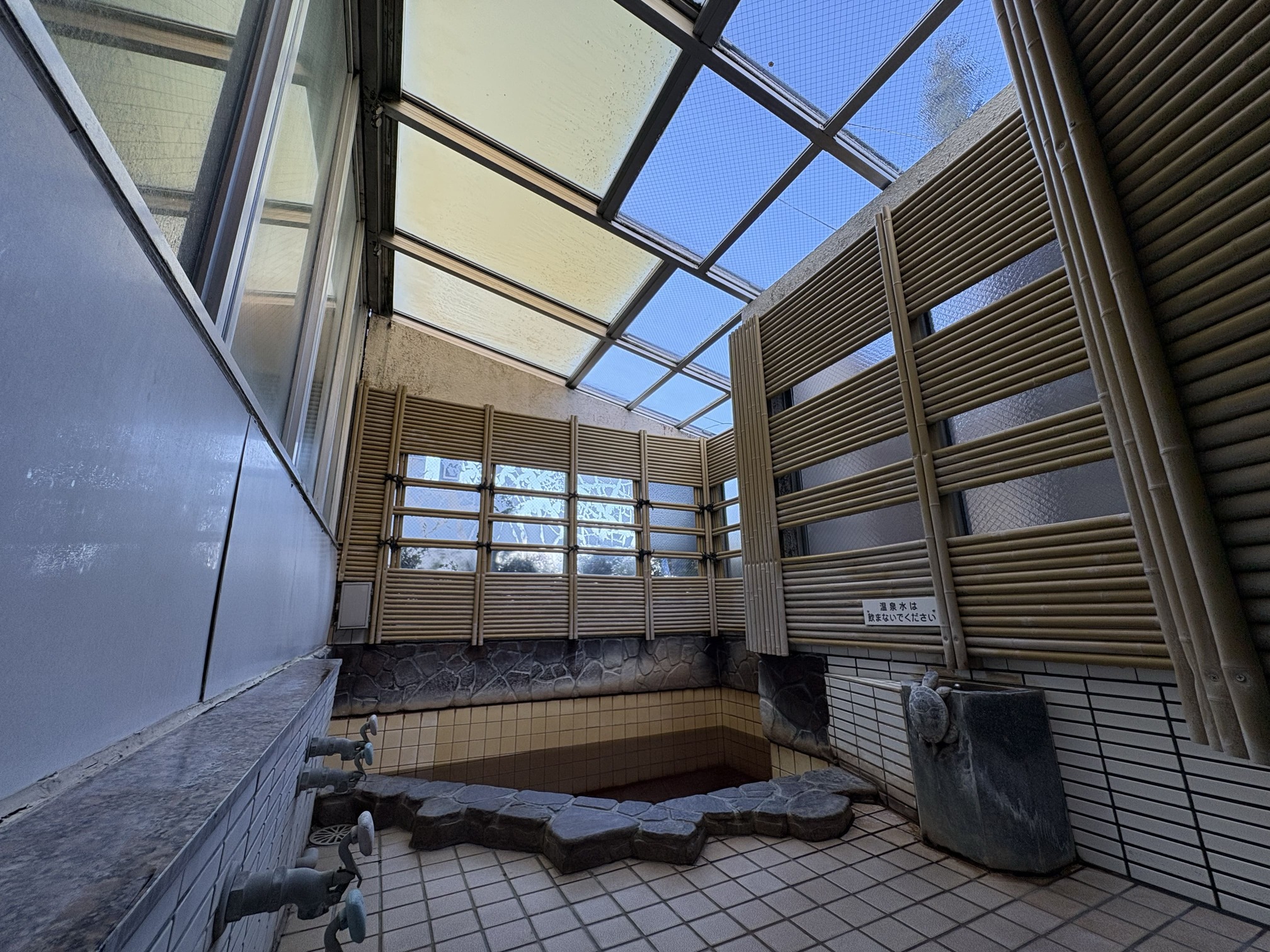 外湯は浅めでコンパクトな半露天風呂。大人が4名くらいは入れる感じ。天井はサンルームのようなガラス張りになっている。