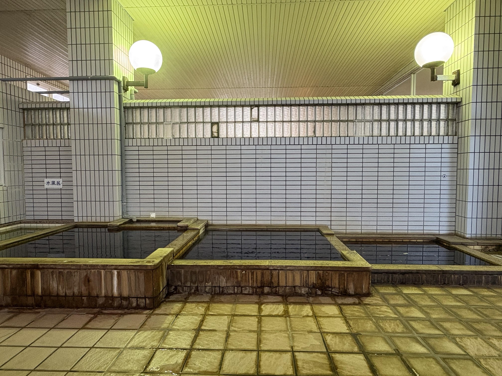 内湯は正面から見て、右が深い湯、真ん中が寝そべって入ることができる浅めの気泡湯。左は腰くらいまでの深さで、腰掛ができるバイブラ湯である。どこも湯船の中に段差があるからちょっと注意がいる。