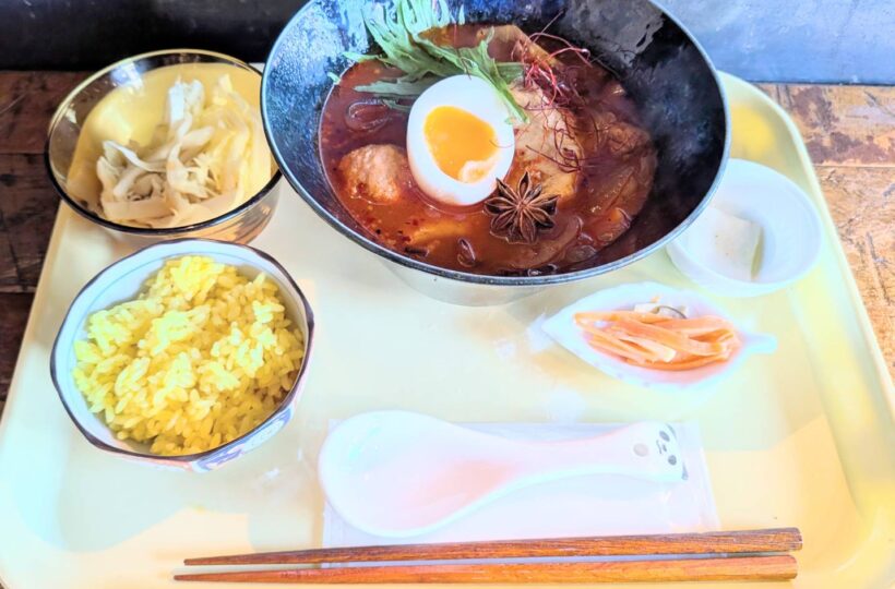 麻辣湯(マーラータン)に小鉢が3つ、ターメリックライスがついてきます。
