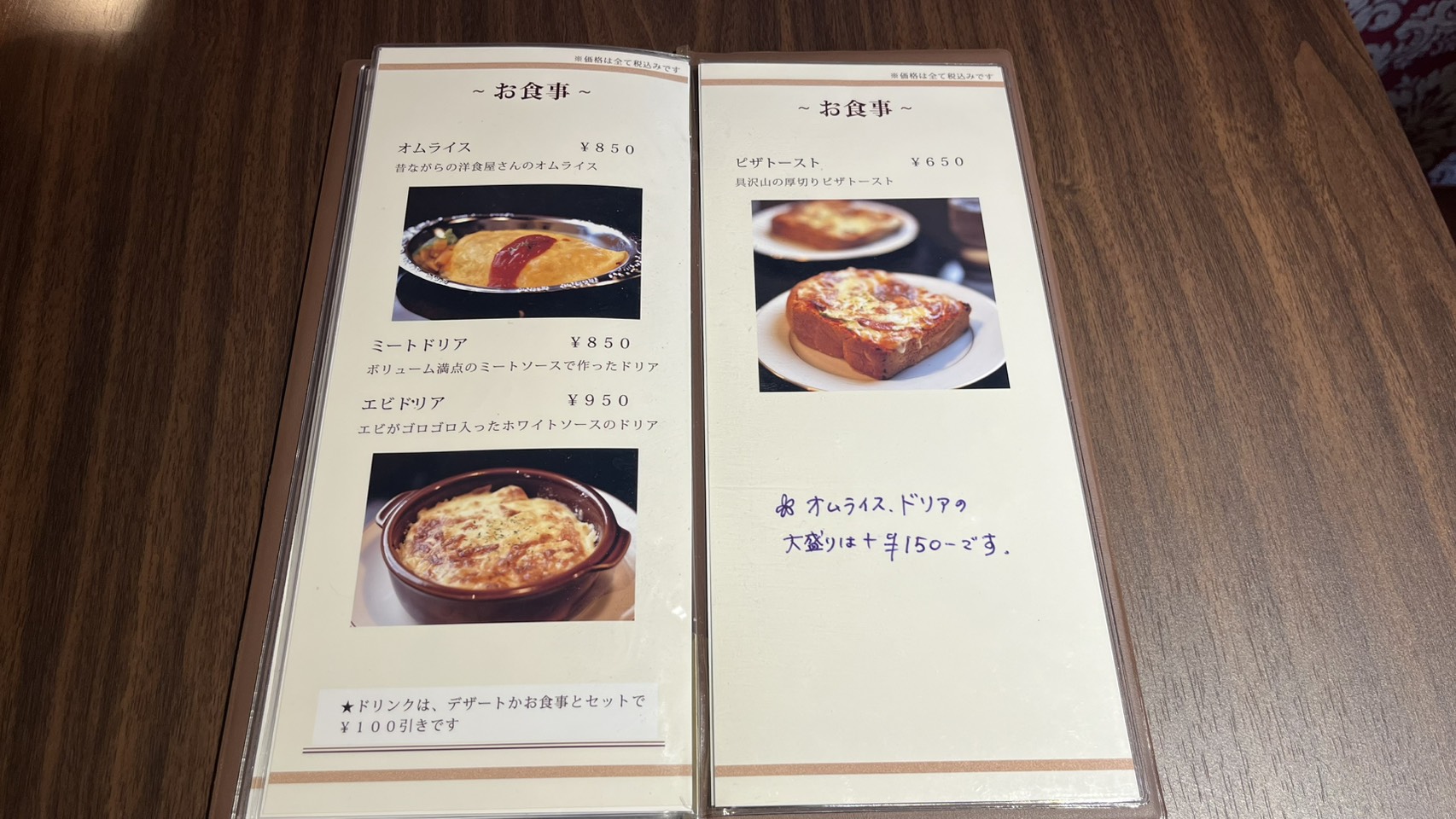 お食事メニューには、オムライス、ドリア、トーストなど、喫茶店らしい品々が並びます。