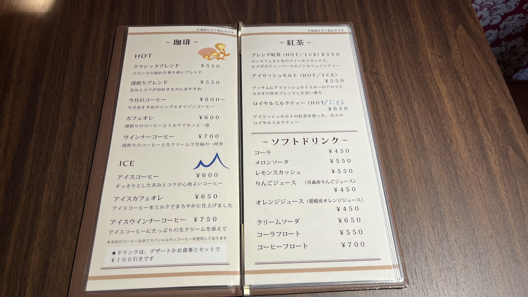 ドリンクメニューも豊富です。コーヒー、紅茶のほか、喫茶店らしいソフトドリンクもいろいろ。