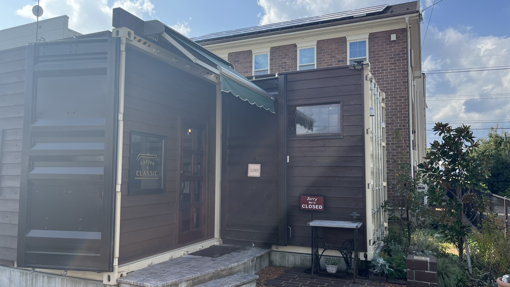 コンテナとは思えない窓や入口がとても素敵な、「喫茶クラシック」さん。