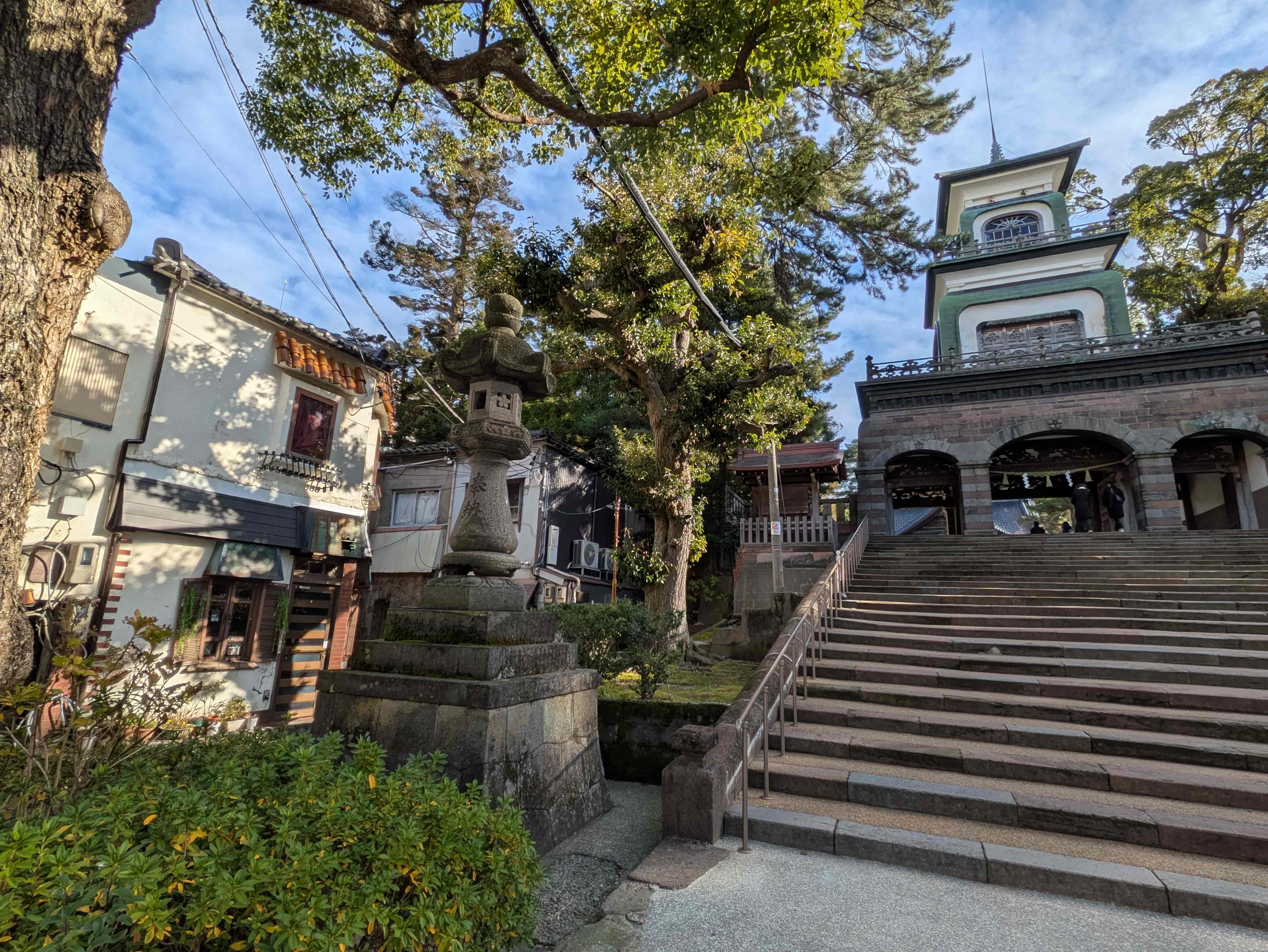 尾山神社付近をそぞろ歩く観光客たちは、みんな笑顔でスマホを構えます。