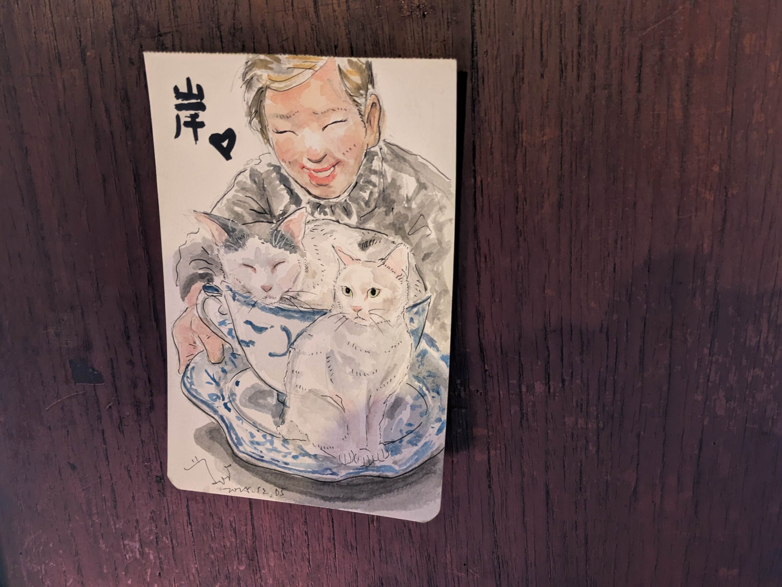 その、カップに入ったネコの絵なんかね。ベトナムから来た人が、その場でサラサラっと描いてくれたんよ。上手いよねぇ。