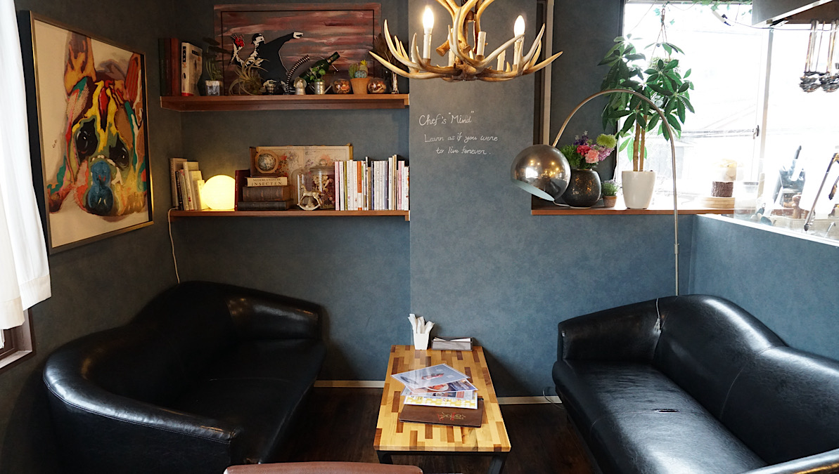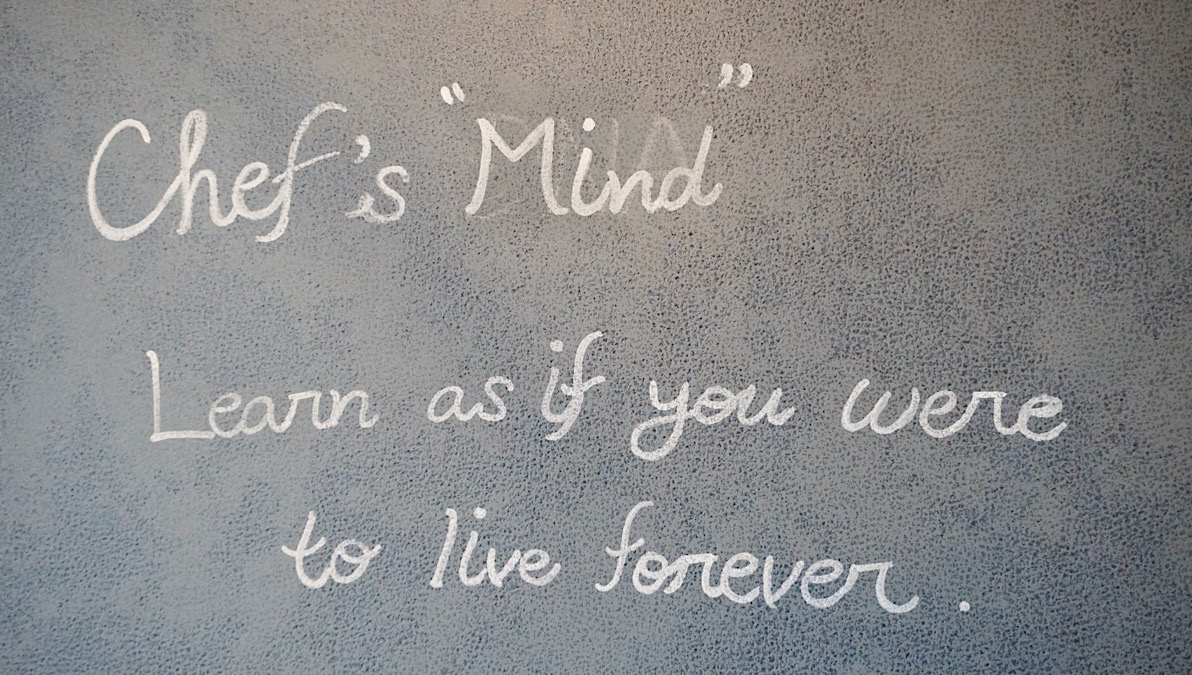 その言葉どおり、店内にはフランス料理をはじめとした料理の専門書がずらりと並び、日々の研鑽を欠かさない姿勢がうかがえます。壁に書かれているのは、「Chef’s “Mind” Learn as if you were to live forever.(シェフの「精神」、永遠に生きるかのように学べ)」というメッセージ。