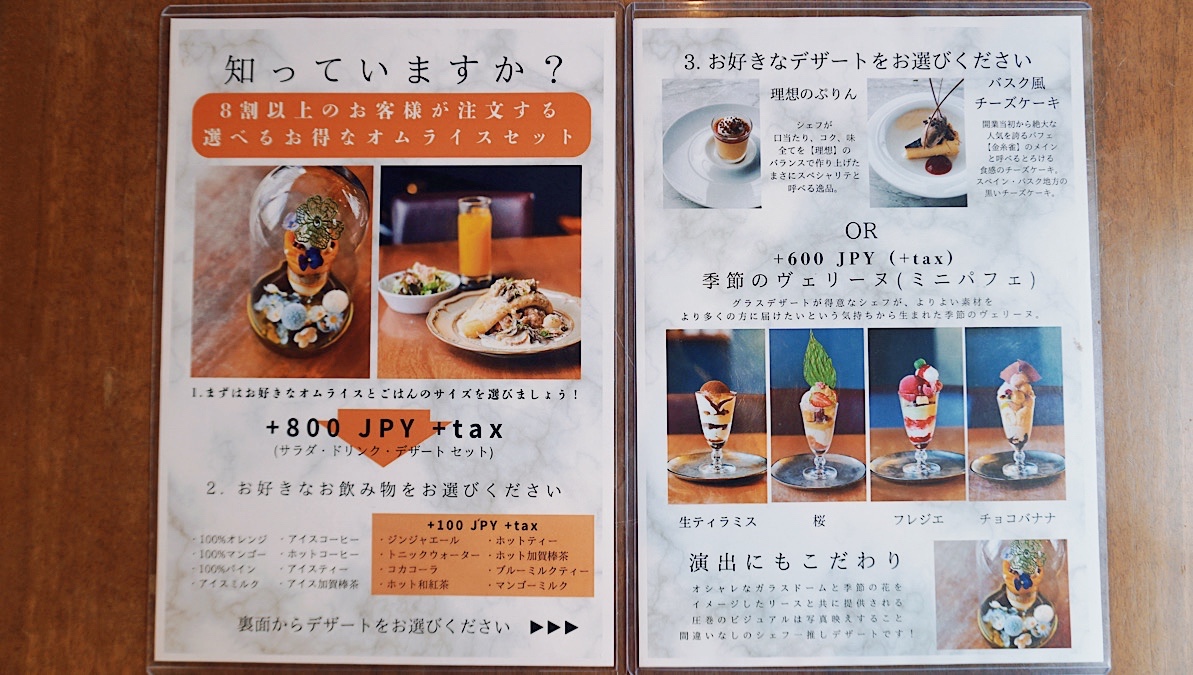 特におすすめしたいのが、オムライスとのセット。さらにプラス660円でヴェリーヌ(ミニパフェ)に変更できるという、うれしい贅沢仕様です。