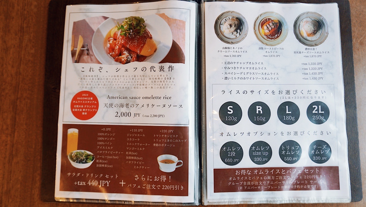 やっぱり、1番人気のオムライス「天使の海老のアメリケーヌソース」を選びました。オムライススタジアム全国大会2023で準グランプリに輝いた実力派のオムライス!これは期待が高まります。
