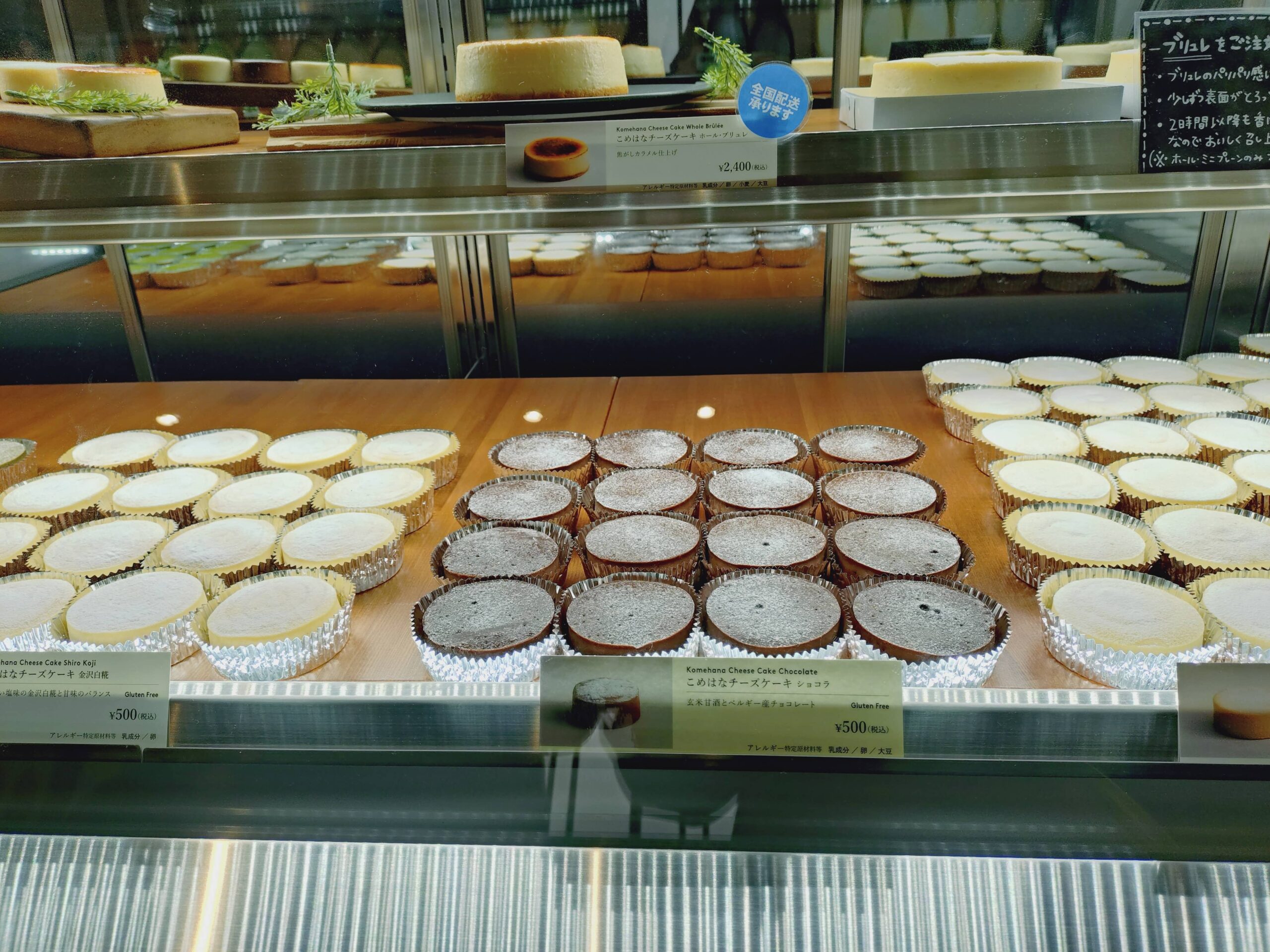 ショーケースには、老舗の発酵技術を活かした米糀入りチーズケーキがずらりと並びます。