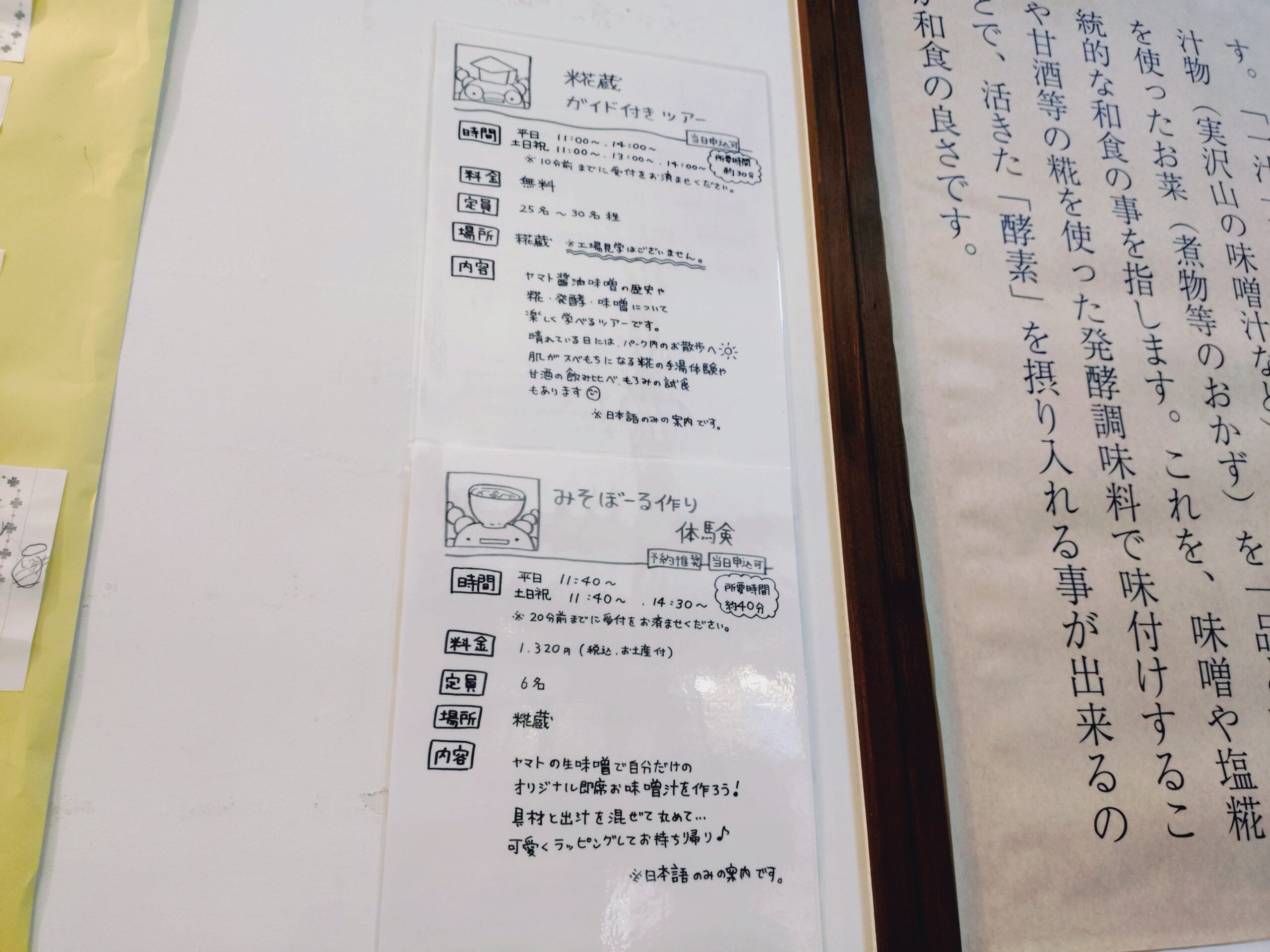 その他にも「みそぼーる作り体験」や「糀部」という料理教室などもあり、デートやお子様連れの体験にもぴったりです。