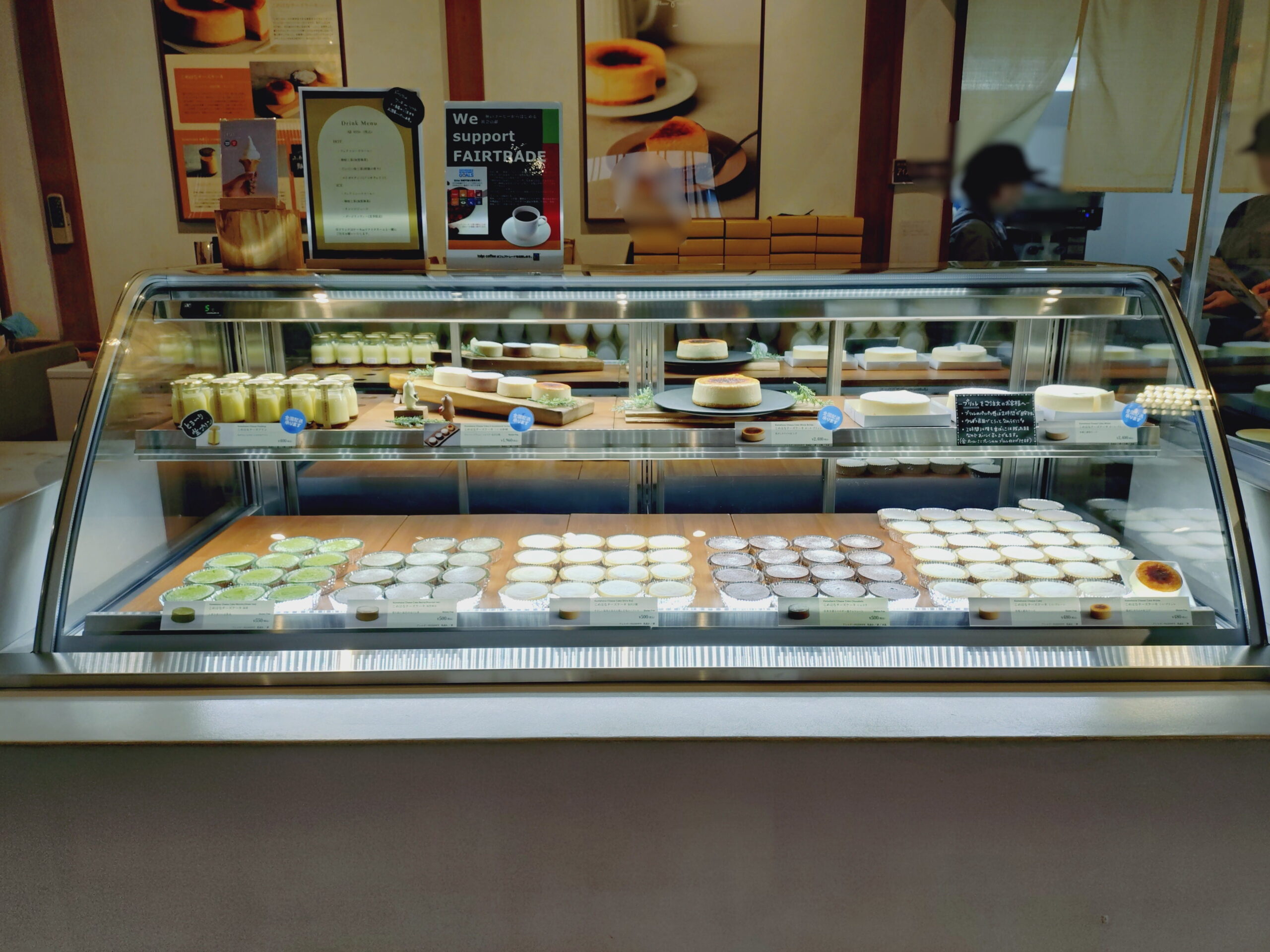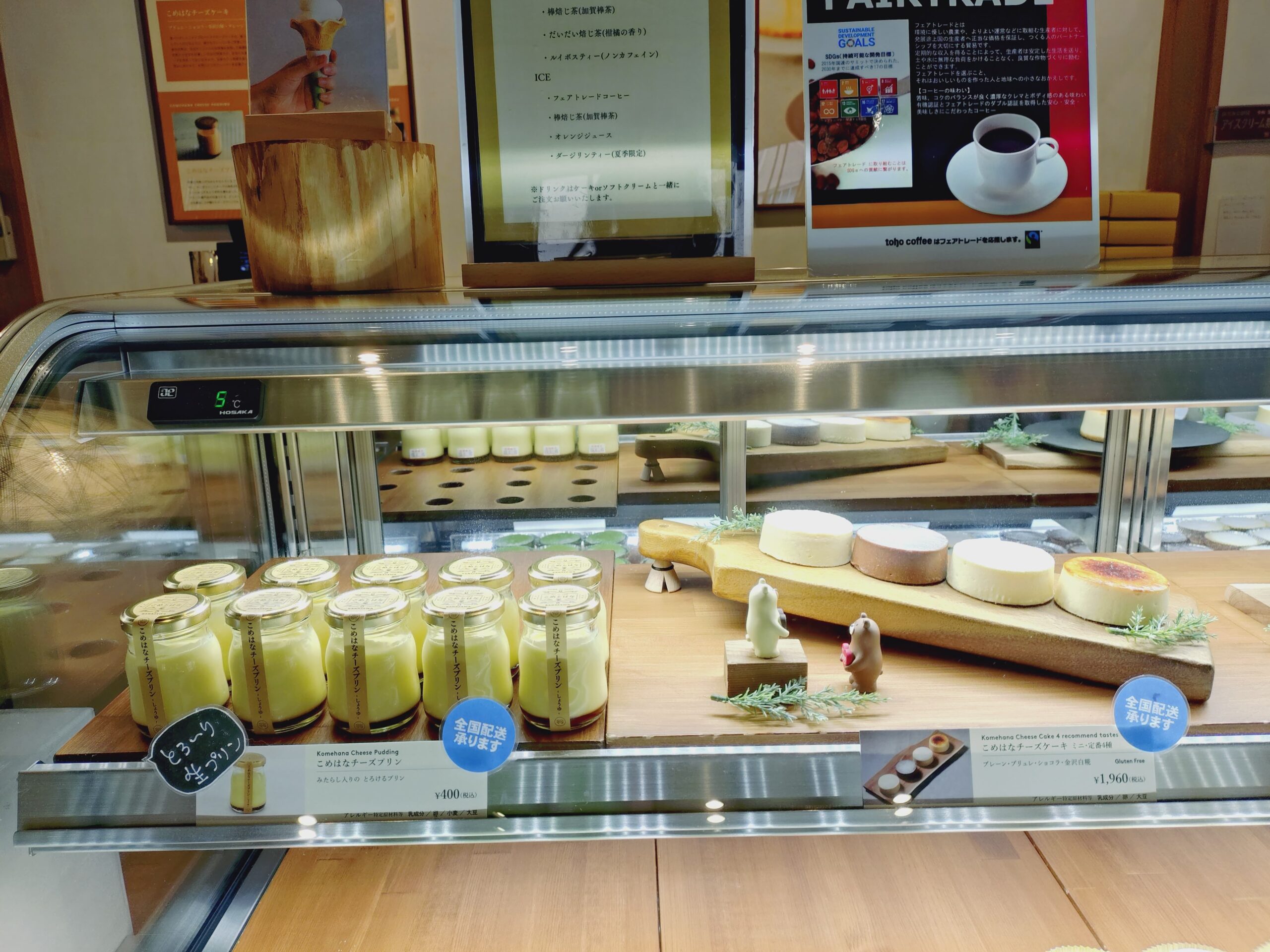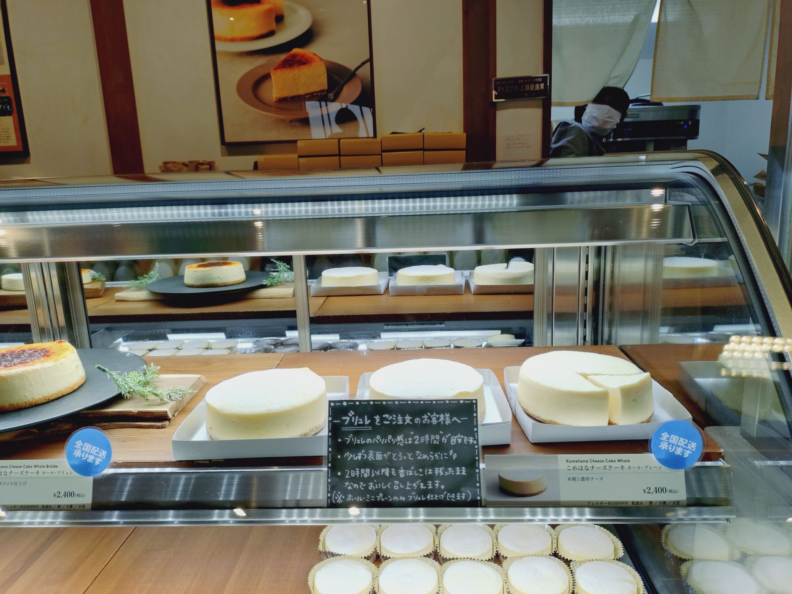 ショーケースには、老舗の発酵技術を活かした米糀入りチーズケーキがずらりと並びます。